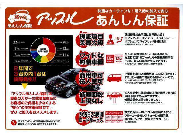 『エンジン・動力系統・吸排気系』等、最大で104項目をカバーする保証内容に、24時間365日対応の保証コールセンターやロードサービスも付帯しておりますので、万が一の故障発生時も安心です。