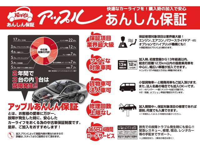 事前の点検整備(エンジン・ミッション・足回り)箇所を保証致します。修理対応は当店指定の工場に限らさせて頂きます。