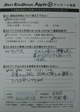 お車のご相談・ 査定だけでもOK! カンタン 入力 30秒 アップルがブランド買取始めました! お電話でも受付中! 受付時間9:30 ~ 18:30 052-805-5411 お車のご相談・ 査定だけでもOK! カンタン 入力 30秒 アップルがブランド買取始めました! お電話でも受付中! 受付時間9:30 ~ 18:30 052-805-5411 アップルがブランド買取始めました! お電話でも受付中! 受付時間9:30 ~ 18:30 052-805-5411 店舗情報 在庫車 スタッフ紹介 ブログ お客様の声 キャンペーン お得 無料査定 click お客様の声 ご記入日: 2015/03/06 K.J様 ■ご利用日時■ H27年3月6日■車種■ デュアリス■担当者■ 阿部【アップルに対する感想をぜひお書きください】満足度★★★★★店員さんの対応、説明の丁寧さが顧客にとっては安心できます。 前へ 次へ お客様の声一覧を見る
