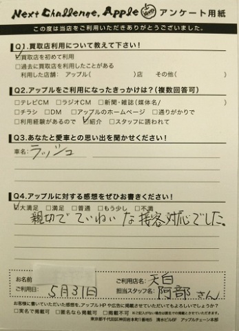 お車のご相談・ 査定だけでもOK! カンタン 入力 30秒 アップルがブランド買取始めました! お電話でも受付中! 受付時間9:30 ~ 18:30 052-805-5411 お車のご相談・ 査定だけでもOK! カンタン 入力 30秒 アップルがブランド買取始めました! お電話でも受付中! 受付時間9:30 ~ 18:30 052-805-5411 アップルがブランド買取始めました! お電話でも受付中! 受付時間9:30 ~ 18:30 052-805-5411 店舗情報 在庫車 スタッフ紹介 ブログ お客様の声 キャンペーン お得 無料査定 click お客様の声 ご記入日: 2015/05/31 K.T様 ■ご利用日時■ H27年5月31日■車種■ ラッシュ■担当者■ 阿部【アップルに対する感想をぜひお書きください】満足度★★★★★親切で丁寧な接客対応でした。 前へ 次へ お客様の声一覧を見る