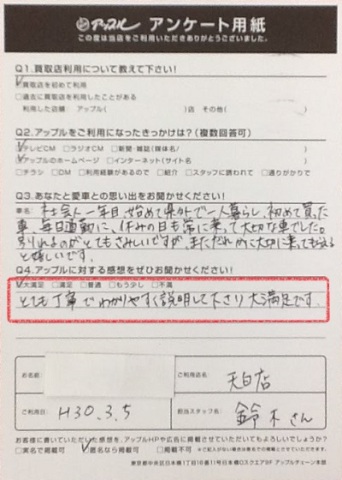 お車のご相談・ 査定だけでもOK! カンタン 入力 30秒 アップルがブランド買取始めました! お電話でも受付中! 受付時間9:30 ~ 18:30 052-805-5411 お車のご相談・ 査定だけでもOK! カンタン 入力 30秒 アップルがブランド買取始めました! お電話でも受付中! 受付時間9:30 ~ 18:30 052-805-5411 アップルがブランド買取始めました! お電話でも受付中! 受付時間9:30 ~ 18:30 052-805-5411 店舗情報 在庫車 スタッフ紹介 ブログ お客様の声 キャンペーン 無料査定 click お客様の声 ご記入日: 2018/03/05 N・Y様 ■ご利用日時■ H 30 年 3 月 5 日■車種■ ライフ■担当者■ 鈴木《アップルに対する感想をぜひお書きください》満足度★★★★★とても丁寧で分かりやすく説明して下さり大満足です。 前へ 次へ お客様の声一覧を見る