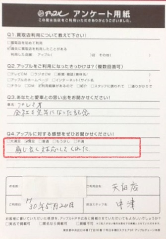 お車のご相談・ 査定だけでもOK! カンタン 入力 30秒 アップルがブランド買取始めました! お電話でも受付中! 受付時間9:30 ~ 18:30 052-805-5411 お車のご相談・ 査定だけでもOK! カンタン 入力 30秒 アップルがブランド買取始めました! お電話でも受付中! 受付時間9:30 ~ 18:30 052-805-5411 アップルがブランド買取始めました! お電話でも受付中! 受付時間9:30 ~ 18:30 052-805-5411 店舗情報 在庫車 スタッフ紹介 ブログ お客様の声 キャンペーン 無料査定 click お客様の声 ご記入日: 2018/05/20 M・T様 ■ご利用日時■ H 30 年 5 月 20 日■車種■ プレミオ■担当者■ 中津《アップルに対する感想をぜひお書きください》満足度★★★★感じ良く対応してくれた。 前へ 次へ お客様の声一覧を見る