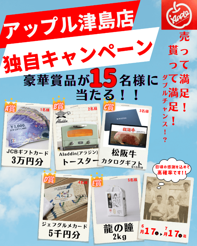 お車のご相談・ 査定だけでもOK! カンタン 入力 30秒 アップルがブランド買取始めました! お電話でも受付中! 受付時間10:00 ~ 19:00 0567-28-8151 お車のご相談・ 査定だけでもOK! カンタン 入力 30秒 アップルがブランド買取始めました! お電話でも受付中! 受付時間10:00 ~ 19:00 0567-28-8151 アップルがブランド買取始めました! お電話でも受付中! 受付時間10:00 ~ 19:00 0567-28-8151 店舗情報 在庫車 スタッフ紹介 ブログ お客様の声 キャンペーン 無料査定 click [ 未分類 ] 2023/08/08 (火) 09:55 ~キャンペーンご当選者様~ 皆様おはようございます🌞🌞🌞本日の津島の天気は曇り???台風も2つあり大変ですね。。。さて今回のブログはキャンペーンご当選者様!!!6月17~7月17迄開催させていただきましたアップル津島店独自キャンペーン沢山のご縁頂きまして本当に感謝感謝です。先日、抽選・ご連絡も終わりご当選者様続々とお越しになっております。龍の瞳!!!美味しいお米をご堪能下さい!以上、柿本でした!!! 2023-08-08 09:55:15 新しい記事へ 古い記事へ 最新記事 ゴールデン~~しまかぜ食堂さん~おしらせ!いっぱいとれるってよ!?~ハイウェイの堕天使~ 店舗情報に戻る 月別アーカイブ 2026年04月(19)2026年03月(27)2026年02月(24)2026年01月(23)2025年12月(23)2025年11月(27)2025年10月(26)2025年09月(26)2025年08月(21)2025年07月(26)2025年06月(26)2025年05月(21)2025年04月(24)2025年03月(27)2025年02月(24)2025年01月(23)2024年12月(23)2024年11月(26)2024年10月(26)2024年09月(26)2024年08月(21)2024年07月(26)2024年06月(26)2024年05月(23)2024年04月(22)2024年03月(27)2024年02月(25)2024年01月(23)2023年12月(23)2023年11月(25)2023年10月(27)2023年09月(26)2023年08月(21)2023年07月(27)2023年06月(26)2023年05月(22)2023年04月(25)2023年03月(26)2023年02月(24)2023年01月(25)2022年12月(24)2022年11月(25)2022年10月(27)2022年09月(26)2022年08月(21)2022年07月(27)2022年06月(25)2022年05月(22)2022年04月(26)2022年03月(26)2022年02月(24)2022年01月(24)2021年12月(22)2021年11月(26)2021年10月(27)2021年09月(25)2021年08月(22)2021年07月(27)2021年06月(25)2021年05月(23)2021年04月(25)2021年03月(26)2021年02月(24)2021年01月(23)2020年12月(23)2020年11月(26)2020年10月(27)2020年09月(24)2020年08月(22)2020年07月(24)2020年06月(25)2020年05月(21)2020年04月(23)2020年03月(26)2020年02月(24)2020年01月(22)2019年12月(21)2019年11月(24)2019年10月(24)2019年09月(22)2019年08月(19)2019年07月(16)2019年06月(18)2019年05月(16)2019年04月(9)2019年03月(4)2019年02月(6)2019年01月(2)2018年12月(3)2018年11月(4)2018年10月(21)2018年09月(25)2018年08月(22)2018年07月(27)2018年06月(24)2018年05月(23)2018年04月(25)2018年03月(27)2018年02月(22)2018年01月(24)2017年12月(23)2017年11月(23)2017年10月(22)2017年09月(23)2017年08月(21)2017年07月(18)2017年06月(12)2017年05月(10)2017年04月(10)2017年03月(7)2017年02月(8)2017年01月(12)2016年12月(12)2016年11月(12)2016年10月(10)2016年09月(17)2016年08月(19)2016年07月(21)2016年06月(5)2016年05月(6)2016年04月(4)2016年03月(4)2016年02月(3)2016年01月(6)2015年12月(6)2015年11月(6)2015年10月(7)2015年09月(8)2015年08月(8)2015年07月(7)2015年06月(6)2015年05月(6)2015年04月(6)2015年03月(6)2015年02月(4)2015年01月(7)2014年12月(7)2014年11月(5)2014年10月(6)2014年09月(8)2014年08月(10)2014年07月(9)2014年06月(12)2014年05月(13)2014年04月(8)2014年03月(3)2014年02月(4)2014年01月(4)2013年12月(4)2013年11月(5)2013年10月(4)2013年09月(2)2013年08月(1)
