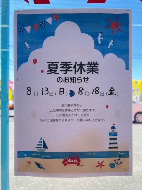 お車のご相談・ 査定だけでもOK! カンタン 入力 30秒 アップルがブランド買取始めました! お電話でも受付中! 受付時間10:00 ~ 19:00 0567-28-8151 お車のご相談・ 査定だけでもOK! カンタン 入力 30秒 アップルがブランド買取始めました! お電話でも受付中! 受付時間10:00 ~ 19:00 0567-28-8151 アップルがブランド買取始めました! お電話でも受付中! 受付時間10:00 ~ 19:00 0567-28-8151 店舗情報 在庫車 スタッフ紹介 ブログ お客様の声 キャンペーン 無料査定 click [ 未分類 ] 2023/08/12 (土) 10:15 夏季休業のお知らせ! アップル津島中央道店のブログをご覧の皆様 こんにちは! アドバイザーの齋藤です( *´艸`) 本日のお天気は 快晴!!! 最高気温も 39度!!! 酷暑日デス(._.) お出かけされる際は 熱中症などには十分に お気を付けください! さて 本日は 「夏季休業のお知らせ」です! 明日8/13(日)~8/18(金)まで 夏季休業となります! 8/19(土)朝10時より 通常営業となります! ご来店予定であったお客様 お間違えの無い様に お願い致します! ご迷惑をおかけしますが宜しくお願い致します。 以上 齋藤でしたっ! 最後までご覧頂きありがとうございました! 2023-08-12 10:15:15 新しい記事へ 古い記事へ 最新記事 ゴールデン~~しまかぜ食堂さん~おしらせ!いっぱいとれるってよ!?~ハイウェイの堕天使~ 店舗情報に戻る 月別アーカイブ 2026年04月(19)2026年03月(27)2026年02月(24)2026年01月(23)2025年12月(23)2025年11月(27)2025年10月(26)2025年09月(26)2025年08月(21)2025年07月(26)2025年06月(26)2025年05月(21)2025年04月(24)2025年03月(27)2025年02月(24)2025年01月(23)2024年12月(23)2024年11月(26)2024年10月(26)2024年09月(26)2024年08月(21)2024年07月(26)2024年06月(26)2024年05月(23)2024年04月(22)2024年03月(27)2024年02月(25)2024年01月(23)2023年12月(23)2023年11月(25)2023年10月(27)2023年09月(26)2023年08月(21)2023年07月(27)2023年06月(26)2023年05月(22)2023年04月(25)2023年03月(26)2023年02月(24)2023年01月(25)2022年12月(24)2022年11月(25)2022年10月(27)2022年09月(26)2022年08月(21)2022年07月(27)2022年06月(25)2022年05月(22)2022年04月(26)2022年03月(26)2022年02月(24)2022年01月(24)2021年12月(22)2021年11月(26)2021年10月(27)2021年09月(25)2021年08月(22)2021年07月(27)2021年06月(25)2021年05月(23)2021年04月(25)2021年03月(26)2021年02月(24)2021年01月(23)2020年12月(23)2020年11月(26)2020年10月(27)2020年09月(24)2020年08月(22)2020年07月(24)2020年06月(25)2020年05月(21)2020年04月(23)2020年03月(26)2020年02月(24)2020年01月(22)2019年12月(21)2019年11月(24)2019年10月(24)2019年09月(22)2019年08月(19)2019年07月(16)2019年06月(18)2019年05月(16)2019年04月(9)2019年03月(4)2019年02月(6)2019年01月(2)2018年12月(3)2018年11月(4)2018年10月(21)2018年09月(25)2018年08月(22)2018年07月(27)2018年06月(24)2018年05月(23)2018年04月(25)2018年03月(27)2018年02月(22)2018年01月(24)2017年12月(23)2017年11月(23)2017年10月(22)2017年09月(23)2017年08月(21)2017年07月(18)2017年06月(12)2017年05月(10)2017年04月(10)2017年03月(7)2017年02月(8)2017年01月(12)2016年12月(12)2016年11月(12)2016年10月(10)2016年09月(17)2016年08月(19)2016年07月(21)2016年06月(5)2016年05月(6)2016年04月(4)2016年03月(4)2016年02月(3)2016年01月(6)2015年12月(6)2015年11月(6)2015年10月(7)2015年09月(8)2015年08月(8)2015年07月(7)2015年06月(6)2015年05月(6)2015年04月(6)2015年03月(6)2015年02月(4)2015年01月(7)2014年12月(7)2014年11月(5)2014年10月(6)2014年09月(8)2014年08月(10)2014年07月(9)2014年06月(12)2014年05月(13)2014年04月(8)2014年03月(3)2014年02月(4)2014年01月(4)2013年12月(4)2013年11月(5)2013年10月(4)2013年09月(2)2013年08月(1)