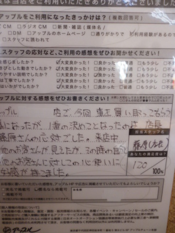 お車のご相談・ 査定だけでもOK! カンタン 入力 30秒 アップルがブランド買取始めました! お電話でも受付中! 受付時間10:00 ~ 19:00 0567-28-8151 お車のご相談・ 査定だけでもOK! カンタン 入力 30秒 アップルがブランド買取始めました! お電話でも受付中! 受付時間10:00 ~ 19:00 0567-28-8151 アップルがブランド買取始めました! お電話でも受付中! 受付時間10:00 ~ 19:00 0567-28-8151 店舗情報 在庫車 スタッフ紹介 ブログ お客様の声 キャンペーン お得 無料査定 click お客様の声 ご記入日: 2012/10/04 匿名希望様 アップルで今回買い取ってもらう事になったが、1番の決めてとなったのは店長 藤原さん の対応でした。来客中他のお客さんがみえたが、その時の自分と他のお客さんに対しての心遣いに好感が持てました。 前へ 次へ お客様の声一覧を見る