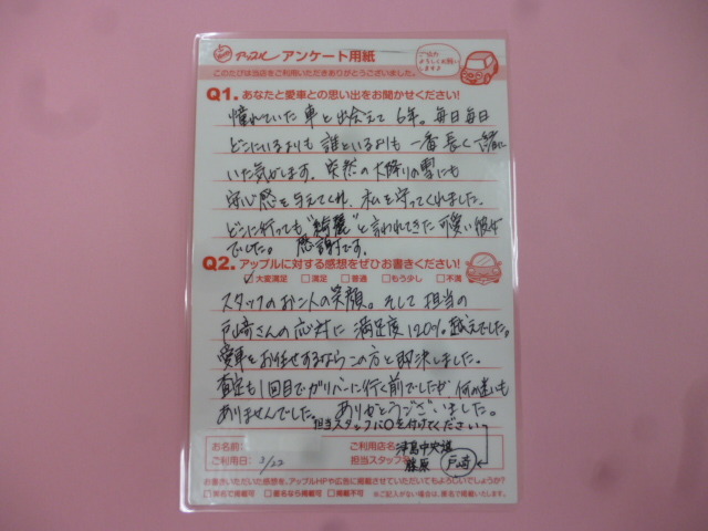スタッフのお二人の笑顔。そして担当の戸崎さんの応対に満足度120%越えでした。愛車をお任せするならこの方と即決しました。査定も一回目で他社に行く前でしたが何の迷いもありませんでした。ありがとうございました。