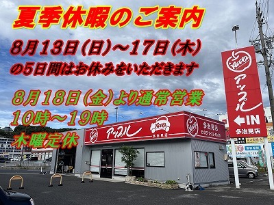お車のご相談・ 査定だけでもOK! カンタン 入力 30秒 アップルがブランド買取始めました! お電話でも受付中! 受付時間10:00 ~ 19:00 0572-23-4600 お車のご相談・ 査定だけでもOK! カンタン 入力 30秒 アップルがブランド買取始めました! お電話でも受付中! 受付時間10:00 ~ 19:00 0572-23-4600 アップルがブランド買取始めました! お電話でも受付中! 受付時間10:00 ~ 19:00 0572-23-4600 店舗情報 在庫車 スタッフ紹介 ブログ お客様の声 キャンペーン お得 無料査定 click [ つぶやき ] 2023/08/08 (火) 07:21 夏季休暇のご案内 アップル多治見店からのお知らせ 2023-08-08 07:21:44 新しい記事へ 古い記事へ 最新記事 エブリィワゴン4WD 入荷しました(^^)//アップル多治見店アップル多治見店GW期間中の休業日のお知らせです。JB23最終10型のジムニー入荷しました/アップル多治見店デリカD5入荷しました/アップル多治見店デリカD5入荷しました(^^)/-アップル多治見店 店舗情報に戻る 月別アーカイブ 2026年04月(2)2026年02月(4)2025年12月(2)2025年11月(2)2024年11月(1)2024年01月(4)2023年12月(1)2023年11月(1)2023年10月(1)2023年09月(1)2023年08月(4)2023年07月(4)2023年06月(4)2023年05月(2)2023年04月(4)2023年03月(2)2023年02月(2)2023年01月(3)2022年12月(2)2022年11月(3)2022年10月(3)2021年09月(1)2021年08月(2)2021年07月(2)2021年06月(1)2021年05月(1)2021年04月(1)2021年03月(2)2021年02月(1)2021年01月(2)2020年12月(3)2020年11月(4)2020年09月(1)2020年08月(1)2020年07月(3)2020年06月(1)2020年05月(4)2020年04月(1)2020年03月(3)2020年02月(2)2019年12月(1)2019年11月(6)2019年10月(3)2019年09月(2)2019年08月(1)2019年07月(4)2019年06月(5)2019年05月(2)2019年04月(3)2019年03月(3)2018年12月(2)2018年11月(2)2018年10月(2)2018年09月(1)2018年08月(4)2018年07月(3)2018年06月(3)2018年05月(4)2018年04月(3)2018年03月(2)2018年02月(2)2018年01月(2)2017年12月(3)2017年11月(3)2017年08月(3)2017年07月(4)2017年05月(1)2017年04月(3)2017年03月(4)2017年02月(3)2017年01月(4)2016年12月(6)2016年11月(4)2016年10月(2)2016年02月(1)2016年01月(1)2015年11月(2)2015年10月(3)2015年09月(4)2015年08月(1)2013年04月(1)