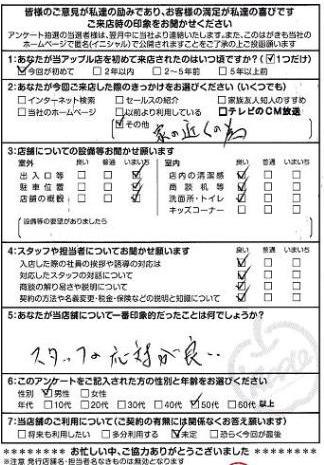 お車のご相談・ 査定だけでもOK! カンタン 入力 30秒 アップルがブランド買取始めました! お電話でも受付中! 受付時間10:00 ~ 19:00 0572-23-4600 お車のご相談・ 査定だけでもOK! カンタン 入力 30秒 アップルがブランド買取始めました! お電話でも受付中! 受付時間10:00 ~ 19:00 0572-23-4600 アップルがブランド買取始めました! お電話でも受付中! 受付時間10:00 ~ 19:00 0572-23-4600 店舗情報 在庫車 スタッフ紹介 ブログ お客様の声 キャンペーン お得 無料査定 click お客様の声 ご記入日: 2013/03/07 M様 スタッフの対応がよい 前へ 次へ お客様の声一覧を見る
