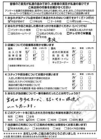 お車のご相談・ 査定だけでもOK! カンタン 入力 30秒 アップルがブランド買取始めました! お電話でも受付中! 受付時間10:00 ~ 19:00 0572-23-4600 お車のご相談・ 査定だけでもOK! カンタン 入力 30秒 アップルがブランド買取始めました! お電話でも受付中! 受付時間10:00 ~ 19:00 0572-23-4600 アップルがブランド買取始めました! お電話でも受付中! 受付時間10:00 ~ 19:00 0572-23-4600 店舗情報 在庫車 スタッフ紹介 ブログ お客様の声 キャンペーン お得 無料査定 click お客様の声 ご記入日: 2013/03/18 E様 室内は多少せまいが、話しやすい環境でいいとおもいます。 前へ 次へ お客様の声一覧を見る