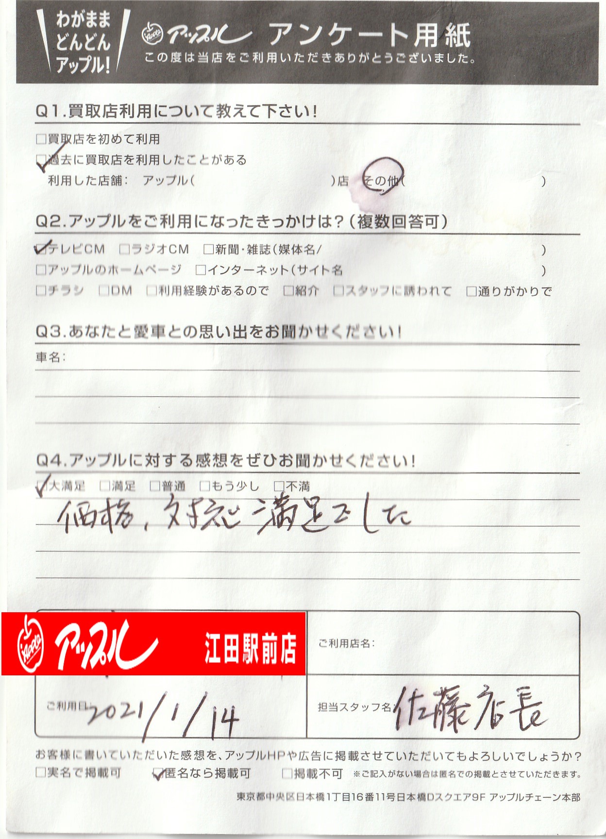 お車のご相談・ 査定だけでもOK! カンタン 入力 30秒 アップルがブランド買取始めました! お電話でも受付中! 受付時間10:00 ~ 19:00 045-912-7560 お車のご相談・ 査定だけでもOK! カンタン 入力 30秒 アップルがブランド買取始めました! お電話でも受付中! 受付時間10:00 ~ 19:00 045-912-7560 アップルがブランド買取始めました! お電話でも受付中! 受付時間10:00 ~ 19:00 045-912-7560 店舗情報 在庫車 スタッフ紹介 ブログ お客様の声 キャンペーン 無料査定 click お客様の声 ご記入日: 2021/01/14 W様 車名:メルセデス・ベンツ Mクラス ≪アップルに対する感想をぜひお聞かせください!≫価格、対応満足でした。 前へ 次へ お客様の声一覧を見る