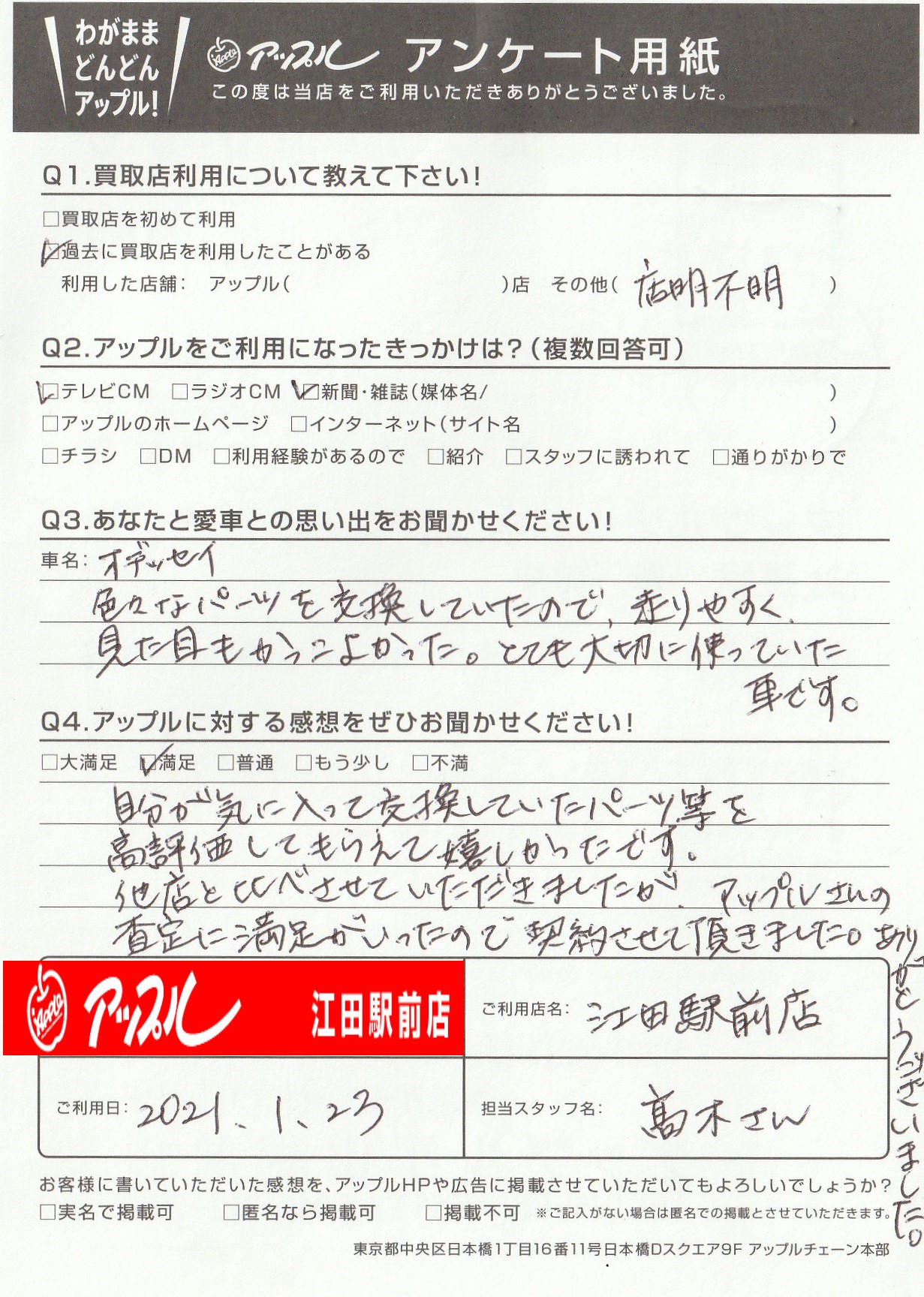 他店と比べさせていただきましたが、アップルさんの査定に満足がいったので、契約させていただきました。ありがとうございました。
