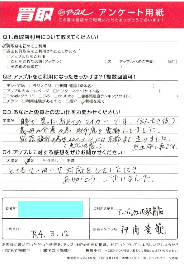 お車のご相談・ 査定だけでもOK! カンタン 入力 30秒 アップルがブランド買取始めました! お電話でも受付中! 受付時間10:00 ~ 19:00 045-912-7560 お車のご相談・ 査定だけでもOK! カンタン 入力 30秒 アップルがブランド買取始めました! お電話でも受付中! 受付時間10:00 ~ 19:00 045-912-7560 アップルがブランド買取始めました! お電話でも受付中! 受付時間10:00 ~ 19:00 045-912-7560 店舗情報 在庫車 スタッフ紹介 ブログ お客様の声 キャンペーン 無料査定 click お客様の声 ご記入日: 2022/03/12 K様 車名:トヨタ ist とてもていねいな対応をしていただき、ありがとうございました。 前へ 次へ お客様の声一覧を見る