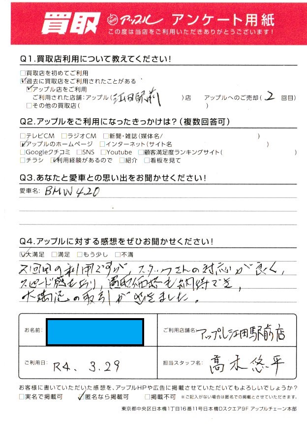 お車のご相談・ 査定だけでもOK! カンタン 入力 30秒 アップルがブランド買取始めました! お電話でも受付中! 受付時間10:00 ~ 19:00 045-912-7560 お車のご相談・ 査定だけでもOK! カンタン 入力 30秒 アップルがブランド買取始めました! お電話でも受付中! 受付時間10:00 ~ 19:00 045-912-7560 アップルがブランド買取始めました! お電話でも受付中! 受付時間10:00 ~ 19:00 045-912-7560 店舗情報 在庫車 スタッフ紹介 ブログ お客様の声 キャンペーン 無料査定 click お客様の声 ご記入日: 2022/03/22 N様 車名:アウディ TT 大変良くして頂きました。毎回ありがとうございます。 前へ 次へ お客様の声一覧を見る