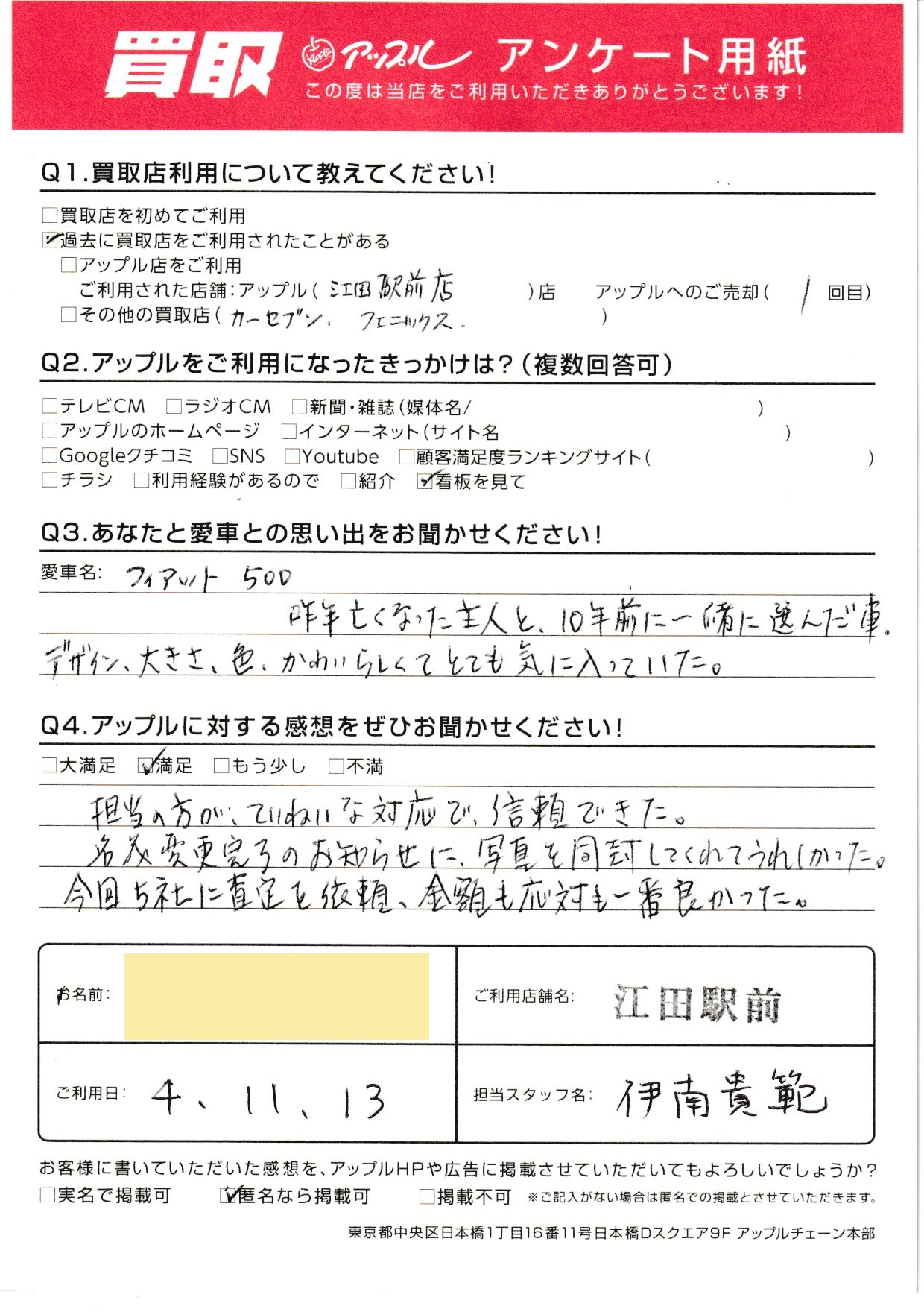お車のご相談・ 査定だけでもOK! カンタン 入力 30秒 アップルがブランド買取始めました! お電話でも受付中! 受付時間10:00 ~ 19:00 045-912-7560 お車のご相談・ 査定だけでもOK! カンタン 入力 30秒 アップルがブランド買取始めました! お電話でも受付中! 受付時間10:00 ~ 19:00 045-912-7560 アップルがブランド買取始めました! お電話でも受付中! 受付時間10:00 ~ 19:00 045-912-7560 店舗情報 在庫車 スタッフ紹介 ブログ お客様の声 キャンペーン 無料査定 click お客様の声 ご記入日: 2022/11/13 N様 車名:フィアット 500(チンクエチェント) 担当の方がていねいな対応で信頼できた。名義変更完了のお知らせに写真を同封してくれてうれしかった。今回5社に査定を依頼、金額も対応も一番良かった。 前へ 次へ お客様の声一覧を見る