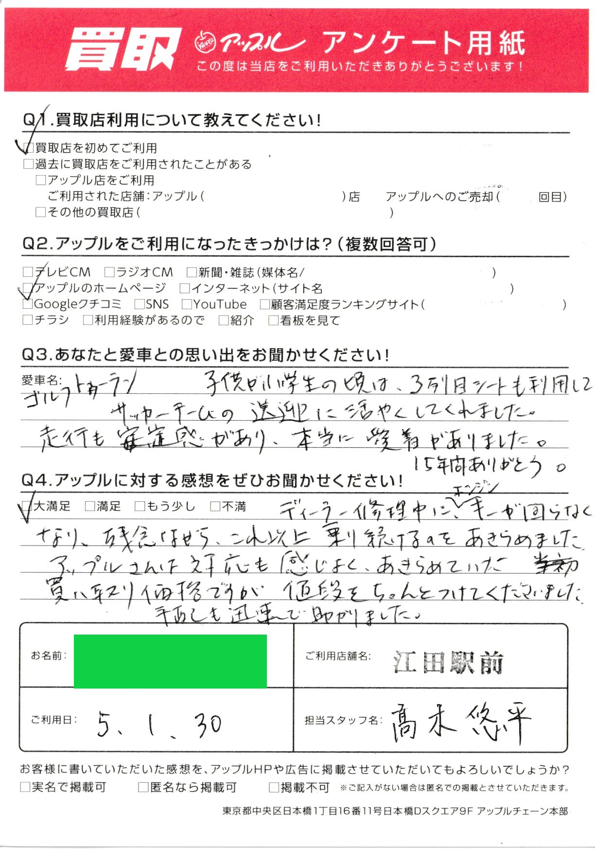 お車のご相談・ 査定だけでもOK! カンタン 入力 30秒 アップルがブランド買取始めました! お電話でも受付中! 受付時間10:00 ~ 19:00 045-912-7560 お車のご相談・ 査定だけでもOK! カンタン 入力 30秒 アップルがブランド買取始めました! お電話でも受付中! 受付時間10:00 ~ 19:00 045-912-7560 アップルがブランド買取始めました! お電話でも受付中! 受付時間10:00 ~ 19:00 045-912-7560 店舗情報 在庫車 スタッフ紹介 ブログ お客様の声 キャンペーン 無料査定 click お客様の声 ご記入日: 2023/01/30 K様 車名:フォルクスワーゲン クロストゥーラン ディーラー修理中にエンジンキーが回らなくなり、残念ながらこれ以上乗り続けるのをあきらめていた。買取価格ですが、値段をちゃんとつけてくださいました。手配も迅速で助かりました。 前へ 次へ お客様の声一覧を見る