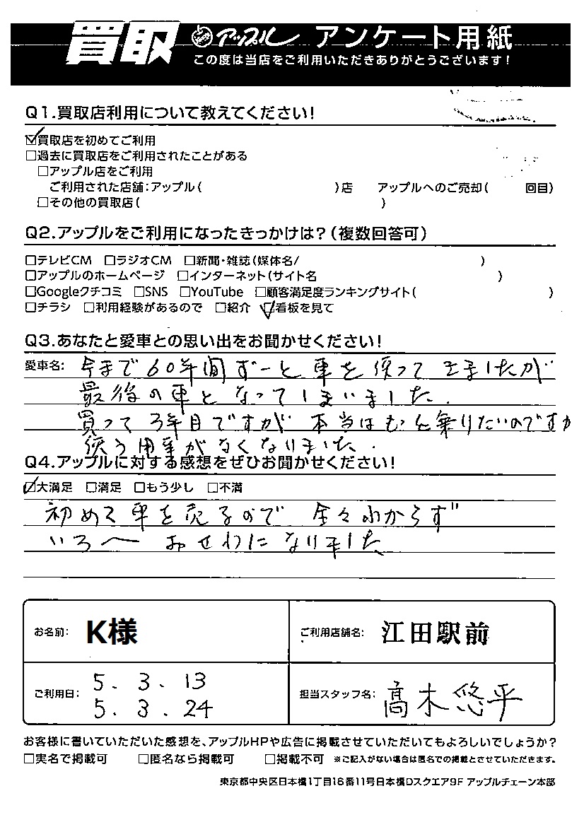 お車のご相談・ 査定だけでもOK! カンタン 入力 30秒 アップルがブランド買取始めました! お電話でも受付中! 受付時間10:00 ~ 19:00 045-912-7560 お車のご相談・ 査定だけでもOK! カンタン 入力 30秒 アップルがブランド買取始めました! お電話でも受付中! 受付時間10:00 ~ 19:00 045-912-7560 アップルがブランド買取始めました! お電話でも受付中! 受付時間10:00 ~ 19:00 045-912-7560 店舗情報 在庫車 スタッフ紹介 ブログ お客様の声 キャンペーン 無料査定 click お客様の声 ご記入日: 2023/03/24 K様 車名:トヨタ ヤリス 初めて車を売るので 全々わからずいろいろお世話になりました。 前へ 次へ お客様の声一覧を見る