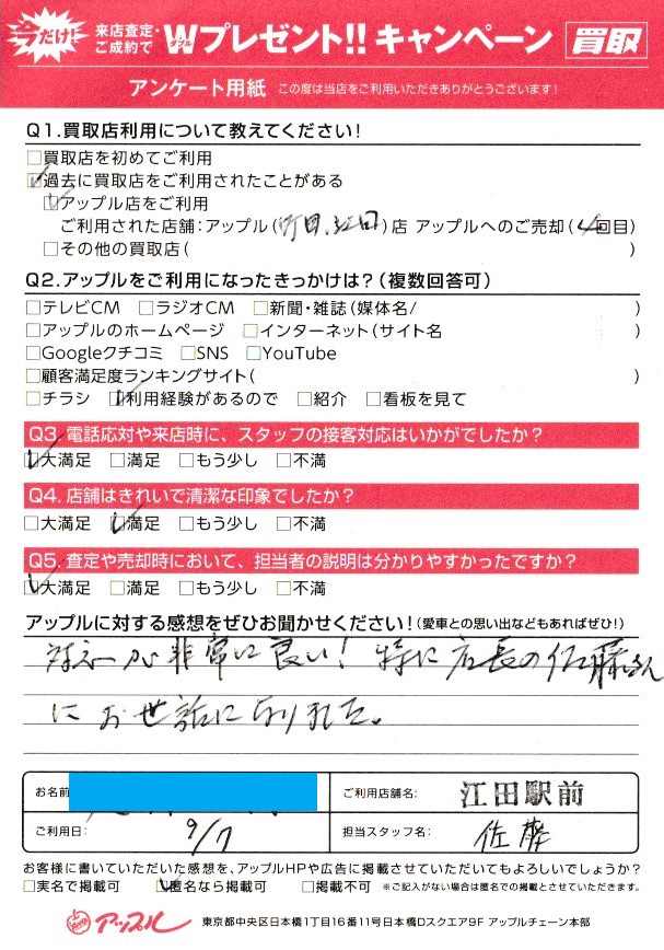 お車のご相談・ 査定だけでもOK! カンタン 入力 30秒 アップルがブランド買取始めました! お電話でも受付中! 受付時間10:00 ~ 19:00 045-912-7560 お車のご相談・ 査定だけでもOK! カンタン 入力 30秒 アップルがブランド買取始めました! お電話でも受付中! 受付時間10:00 ~ 19:00 045-912-7560 アップルがブランド買取始めました! お電話でも受付中! 受付時間10:00 ~ 19:00 045-912-7560 店舗情報 在庫車 スタッフ紹介 ブログ お客様の声 キャンペーン 無料査定 click お客様の声 ご記入日: 2023/09/07 K様 車名:ホンダ フィットハイブリッド(~H25年9月) 対応が非常に良い!特に店長の佐藤さんにお世話になりました。 前へ 次へ お客様の声一覧を見る