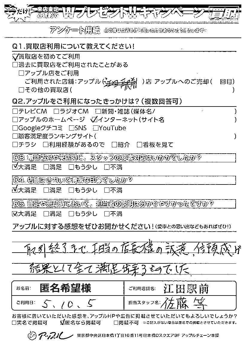 お車のご相談・ 査定だけでもOK! カンタン 入力 30秒 アップルがブランド買取始めました! お電話でも受付中! 受付時間10:00 ~ 19:00 045-912-7560 お車のご相談・ 査定だけでもOK! カンタン 入力 30秒 アップルがブランド買取始めました! お電話でも受付中! 受付時間10:00 ~ 19:00 045-912-7560 アップルがブランド買取始めました! お電話でも受付中! 受付時間10:00 ~ 19:00 045-912-7560 店舗情報 在庫車 スタッフ紹介 ブログ お客様の声 キャンペーン 無料査定 click お客様の声 ご記入日: 2024/01/15 匿名希望様 ご利用日:R5年10月5日 担当:佐藤 等アップルに対する感想をぜひお聞かせください!取引終了まで担当の店長様の誠意、信頼感が結果として全て満足出来るものでした。 前へ 次へ お客様の声一覧を見る