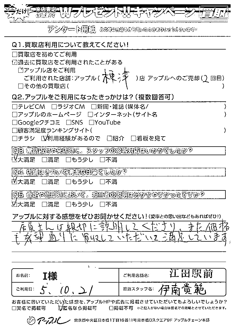 お車のご相談・ 査定だけでもOK! カンタン 入力 30秒 アップルがブランド買取始めました! お電話でも受付中! 受付時間10:00 ~ 19:00 045-912-7560 お車のご相談・ 査定だけでもOK! カンタン 入力 30秒 アップルがブランド買取始めました! お電話でも受付中! 受付時間10:00 ~ 19:00 045-912-7560 アップルがブランド買取始めました! お電話でも受付中! 受付時間10:00 ~ 19:00 045-912-7560 店舗情報 在庫車 スタッフ紹介 ブログ お客様の声 キャンペーン 無料査定 click お客様の声 ご記入日: 2024/01/21 I様 ご利用日:R5年10月21日 担当:伊南貴範アップルに対する感想をぜひお聞かせください!店員さんは親切に説明してくださり、また価格も希望通りに買取していただいて満足しています。 前へ 次へ お客様の声一覧を見る