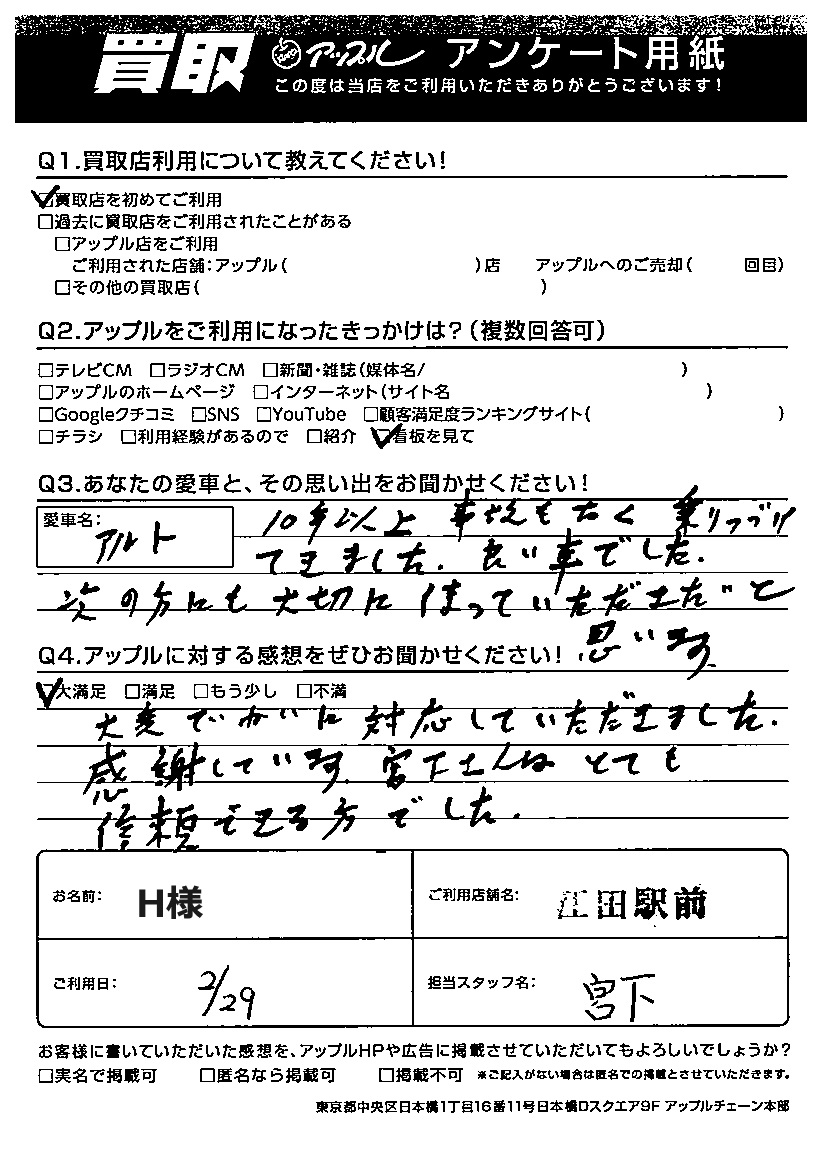 H様 車名:スズキ アルト (2015年12月以降のワークス含む)