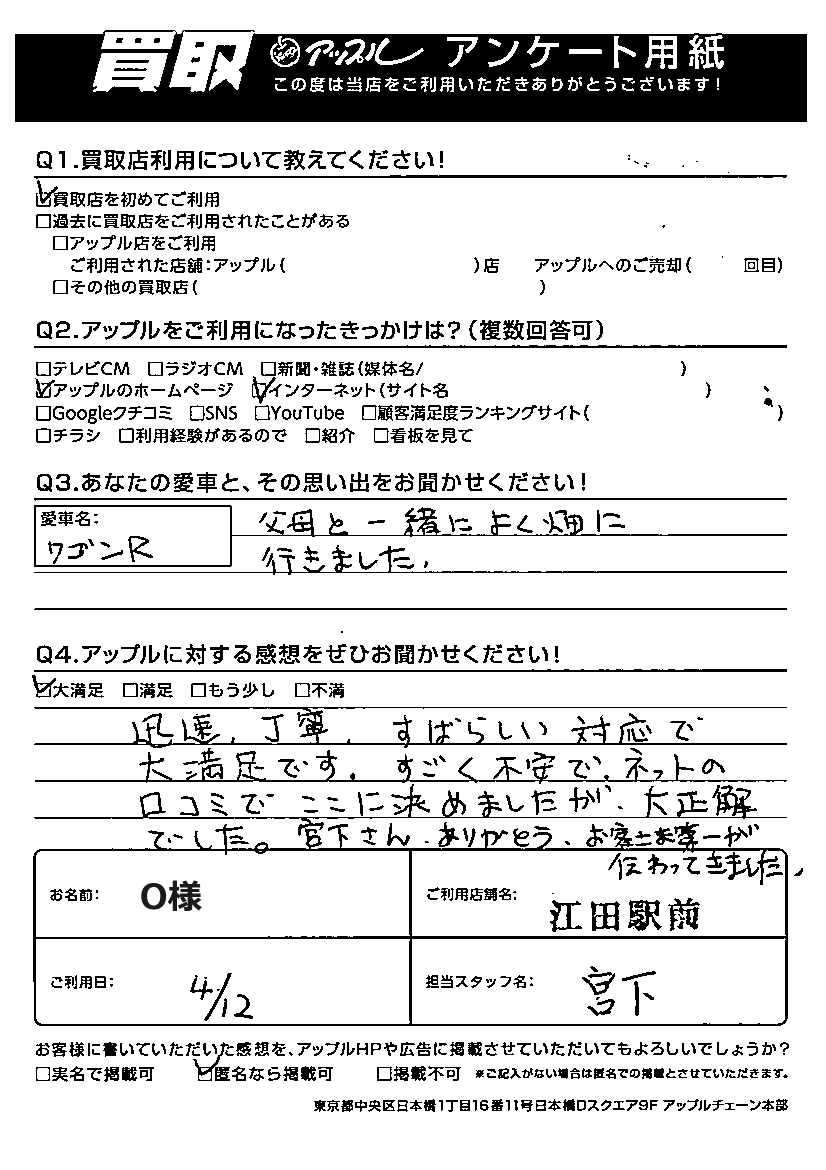 お車のご相談・ 査定だけでもOK! カンタン 入力 30秒 アップルがブランド買取始めました! お電話でも受付中! 受付時間10:00 ~ 19:00 045-912-7560 お車のご相談・ 査定だけでもOK! カンタン 入力 30秒 アップルがブランド買取始めました! お電話でも受付中! 受付時間10:00 ~ 19:00 045-912-7560 アップルがブランド買取始めました! お電話でも受付中! 受付時間10:00 ~ 19:00 045-912-7560 店舗情報 在庫車 スタッフ紹介 ブログ お客様の声 キャンペーン 無料査定 click お客様の声 ご記入日: 2024/04/12 O様 車名:スズキ ワゴンR 迅速、丁寧、すばらしい対応で、大満足です。すごく不安でネットの口コミでここに決めましたが、大正解でした。宮下さん、ありがとう。お客さま第一が伝わってきました。 前へ 次へ お客様の声一覧を見る