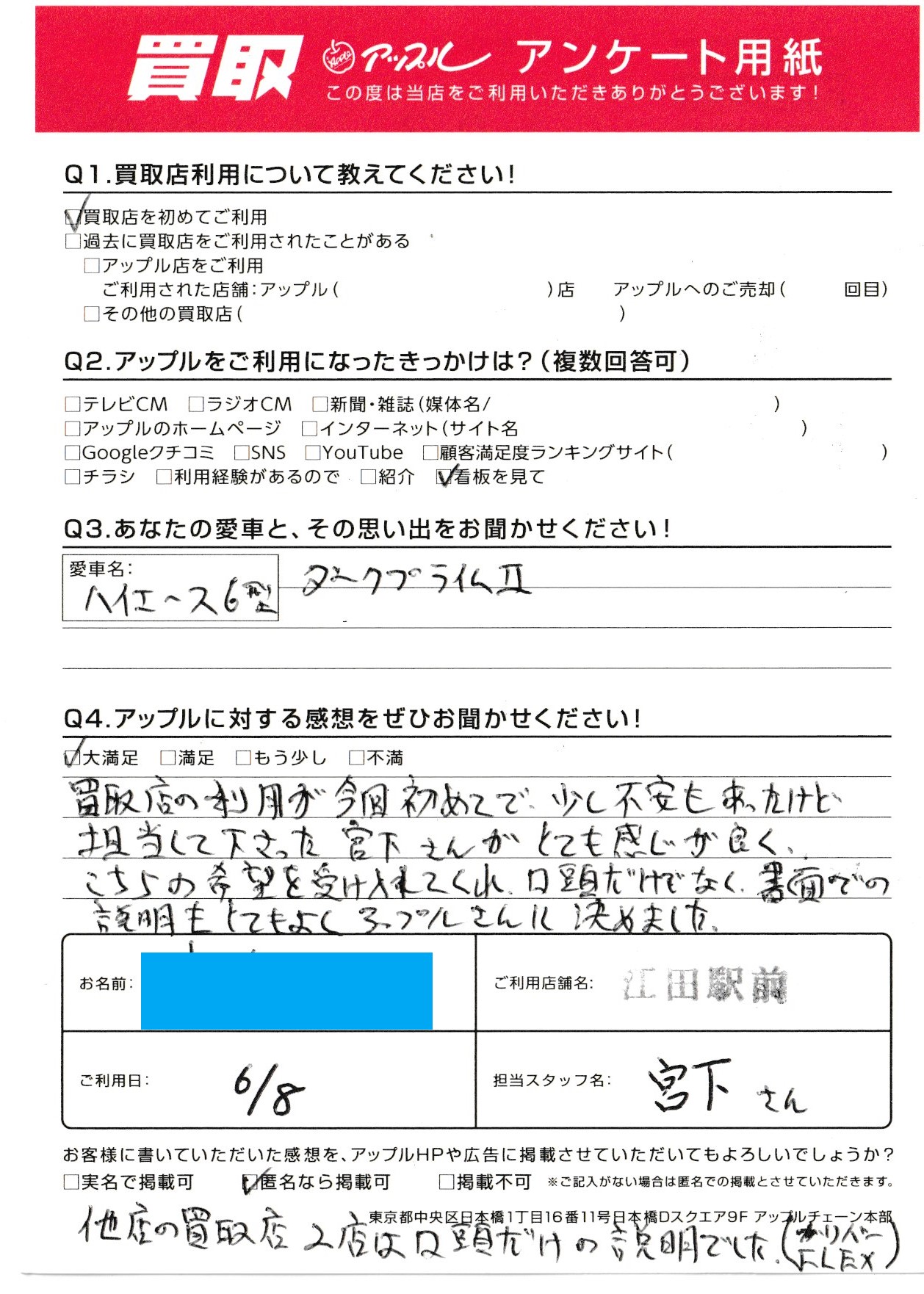 買取店の利用が今回初めてで、少し不安もあったけど、担当して下さった宮下さんがとても感じが良く、こちらの希望を受け入れてくれ、口頭だけでなく書面での説明もとてもよく、アップルさんに決めました。