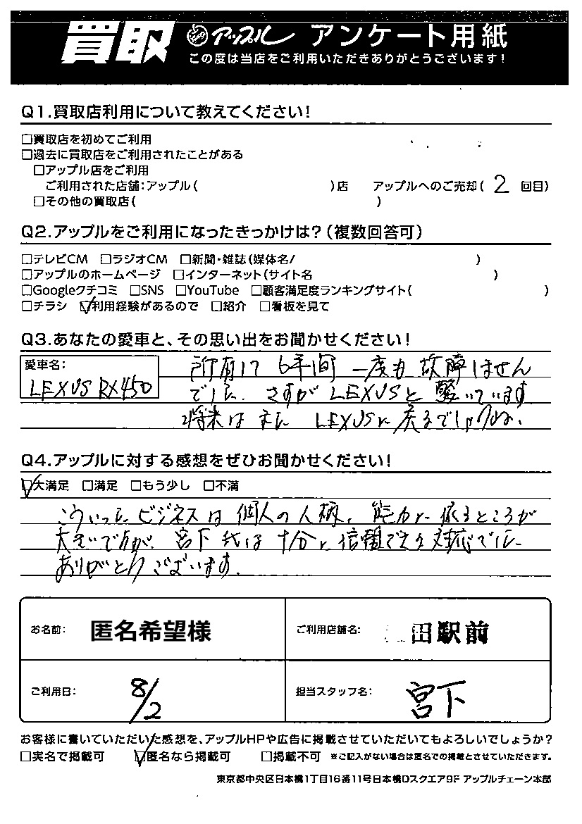 匿名希望様 車名:レクサス RX (国内仕様 右H(H27年10月~HYBRID含)