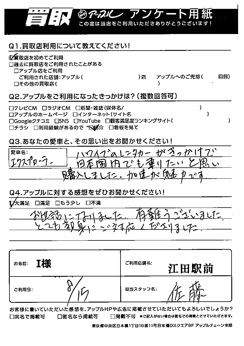 I様 車名:フォード エクスプローラー