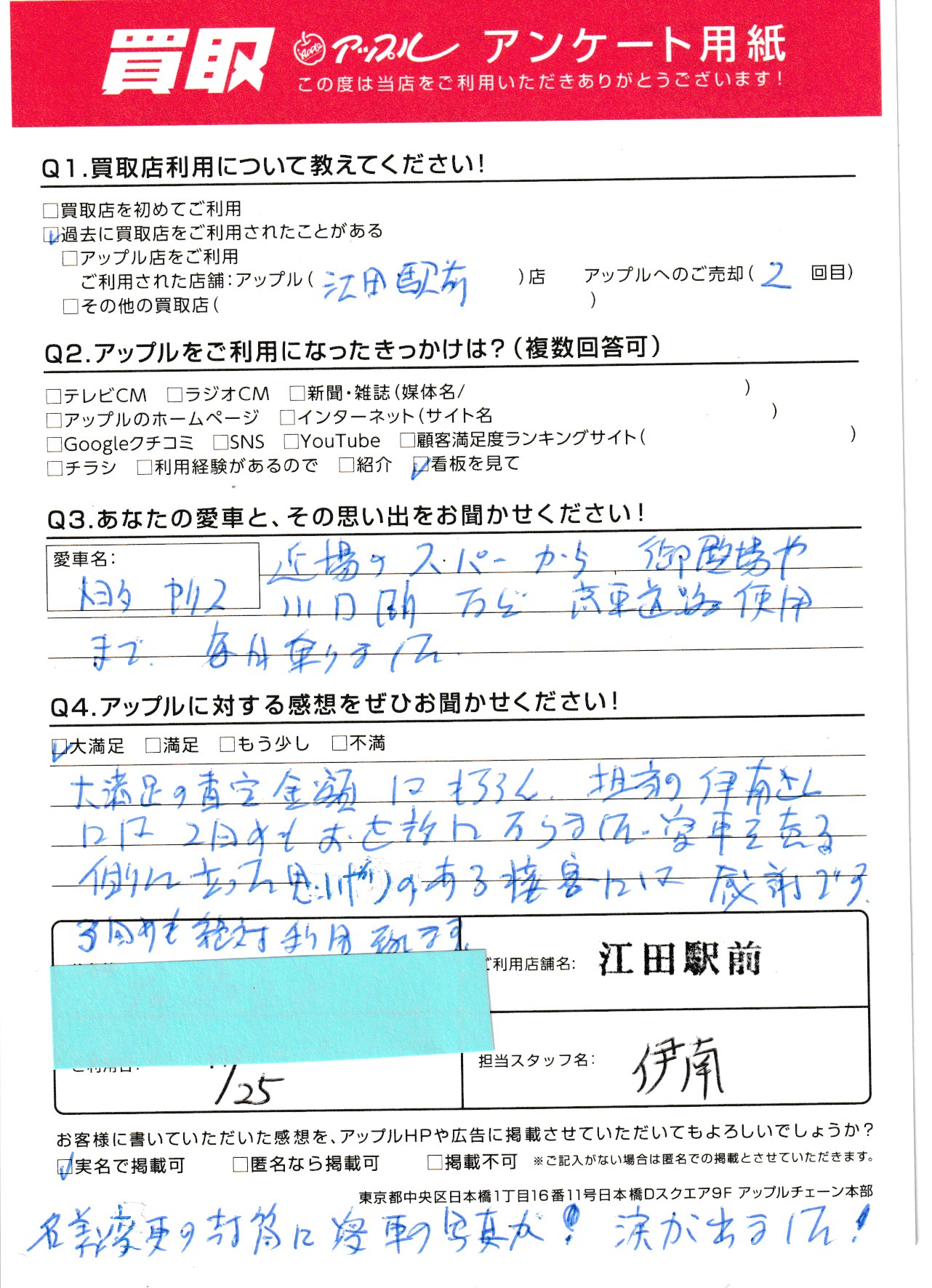大満足の査定金額はもちろん、担当の伊南さんには2回目もお世話になりました。愛車を売る側にたった思いやりのある接客には感謝です。3回目も絶対利用します。