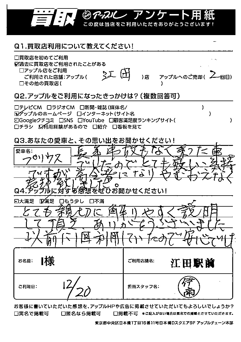 A.愛車名:プリウス 長年事故もなく乗った車でしたのでとても寂しい気持ちですが、高齢者になり