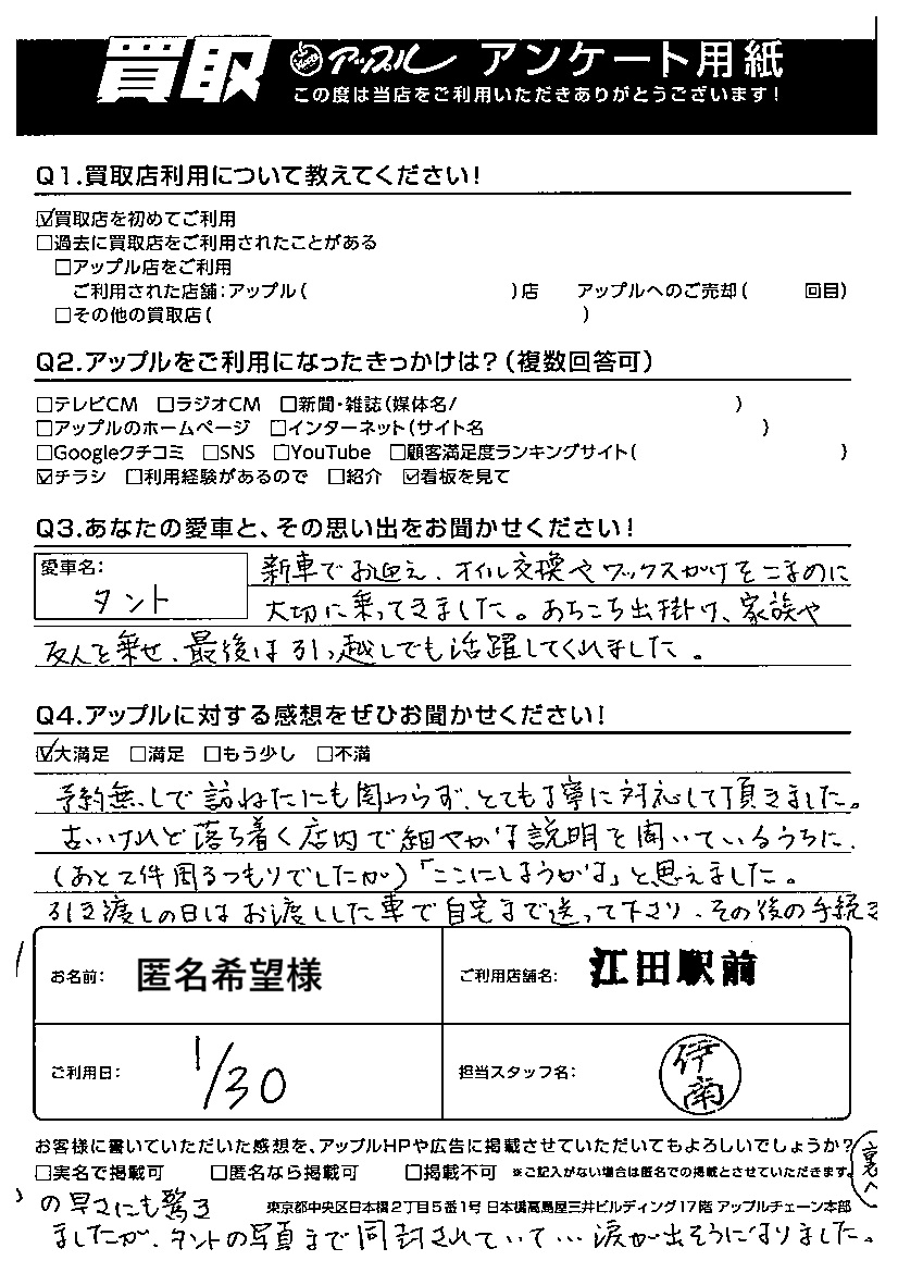 しした車で自宅まで送って下さり、その後の手続きの早さにも驚きましたが、タントの写真まで同封されていて、