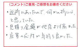 お車のご相談・ 査定だけでもOK! カンタン 入力 30秒 アップルがブランド買取始めました! お電話でも受付中! 受付時間10:00 ~ 19:00 045-912-7560 お車のご相談・ 査定だけでもOK! カンタン 入力 30秒 アップルがブランド買取始めました! お電話でも受付中! 受付時間10:00 ~ 19:00 045-912-7560 アップルがブランド買取始めました! お電話でも受付中! 受付時間10:00 ~ 19:00 045-912-7560 店舗情報 在庫車 スタッフ紹介 ブログ お客様の声 キャンペーン 無料査定 click お客様の声 ご記入日: 2012/05/02 T・T様 ・近所にあったので、何かの折にはと思っていた。・見積もり金額が他店よりも高かった。・店員の対応が気持ちよかった。 前へ 次へ お客様の声一覧を見る