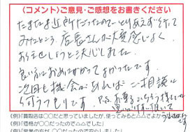お車のご相談・ 査定だけでもOK! カンタン 入力 30秒 アップルがブランド買取始めました! お電話でも受付中! 受付時間10:00 ~ 19:00 045-912-7560 お車のご相談・ 査定だけでもOK! カンタン 入力 30秒 アップルがブランド買取始めました! お電話でも受付中! 受付時間10:00 ~ 19:00 045-912-7560 アップルがブランド買取始めました! お電話でも受付中! 受付時間10:00 ~ 19:00 045-912-7560 店舗情報 在庫車 スタッフ紹介 ブログ お客様の声 キャンペーン 無料査定 click お客様の声 ご記入日: 2012/05/01 N・A様 たまたま近所だったので、とりあえずいってみたところ、店長さんが大変感じがよく、お任せしようと決心しました。良い方にお目にかかって良かったです。次回も機会があれば御相談に伺うつもりです。 前へ 次へ お客様の声一覧を見る