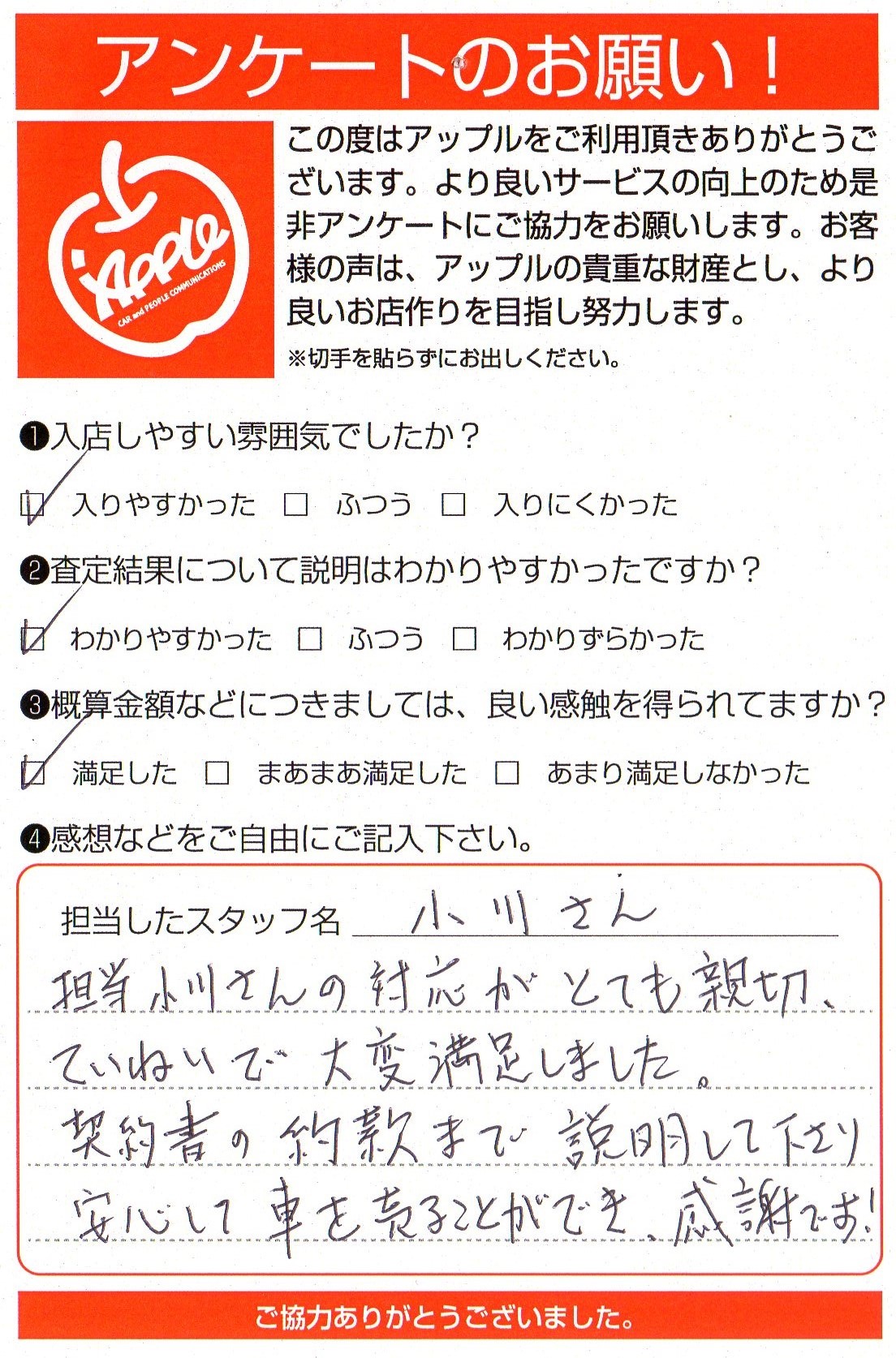 お車のご相談・ 査定だけでもOK! カンタン 入力 30秒 アップルがブランド買取始めました! お電話でも受付中! 受付時間10:00 ~ 19:00 045-912-7560 お車のご相談・ 査定だけでもOK! カンタン 入力 30秒 アップルがブランド買取始めました! お電話でも受付中! 受付時間10:00 ~ 19:00 045-912-7560 アップルがブランド買取始めました! お電話でも受付中! 受付時間10:00 ~ 19:00 045-912-7560 店舗情報 在庫車 スタッフ紹介 ブログ お客様の声 キャンペーン 無料査定 click お客様の声 ご記入日: 2020/01/25 U様 車名:トヨタ プリウス(2023年3月~のPHVを含む) 担当小川さんの対応がとても親切、ていねいで、大変満足しました。契約書の約款まで説明してくださり、安心して車を売ることができ、感謝です。 前へ 次へ お客様の声一覧を見る