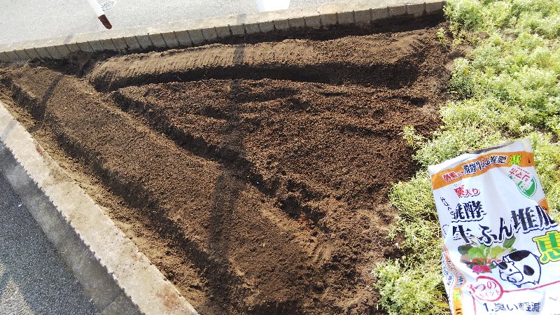畑(花壇)は、たい肥などを入れて耕して畝を作ります。