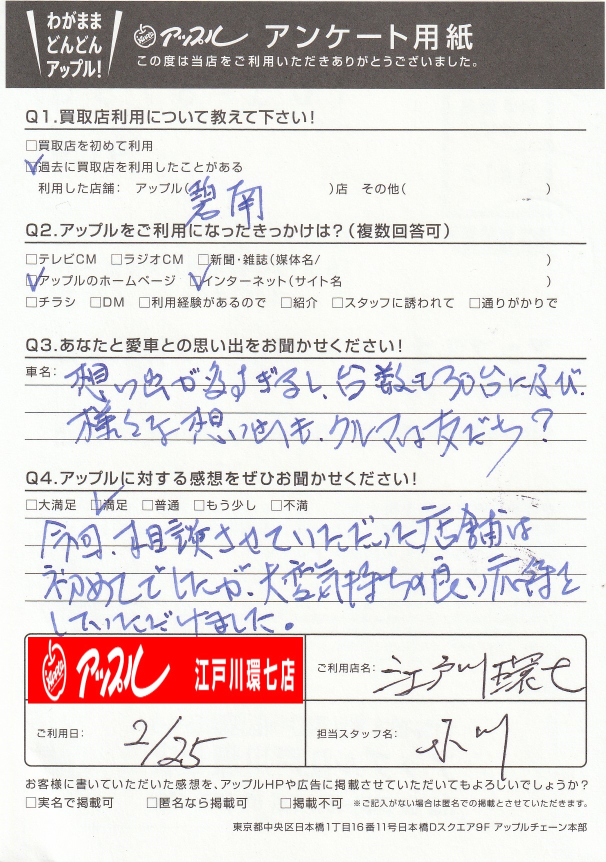 お車のご相談・ 査定だけでもOK! カンタン 入力 30秒 アップルがブランド買取始めました! お電話でも受付中! 受付時間10:00 ~ 19:00(最終査定受付時間は18:00です) 03-5658-0393 お車のご相談・ 査定だけでもOK! カンタン 入力 30秒 アップルがブランド買取始めました! お電話でも受付中! 受付時間10:00 ~ 19:00(最終査定受付時間は18:00です) 03-5658-0393 アップルがブランド買取始めました! お電話でも受付中! 受付時間10:00 ~ 19:00(最終査定受付時間は18:00です) 03-5658-0393 店舗情報 在庫車 スタッフ紹介 ブログ お客様の声 キャンペーン お得 無料査定 click お客様の声 ご記入日: -/-/- N様 車名:三菱 アイ Q:あなたと愛車の思い出をお聞かせください!思い出が多すぎるし、台数も30台に及び、様々な思いも、車は友だち?Q:アップルに対する感想をぜひお聞かせください!今回、相談させて頂いた店舗は初めてでしたが、大変気持ちの良い応対をしていただけました。 前へ 次へ お客様の声一覧を見る