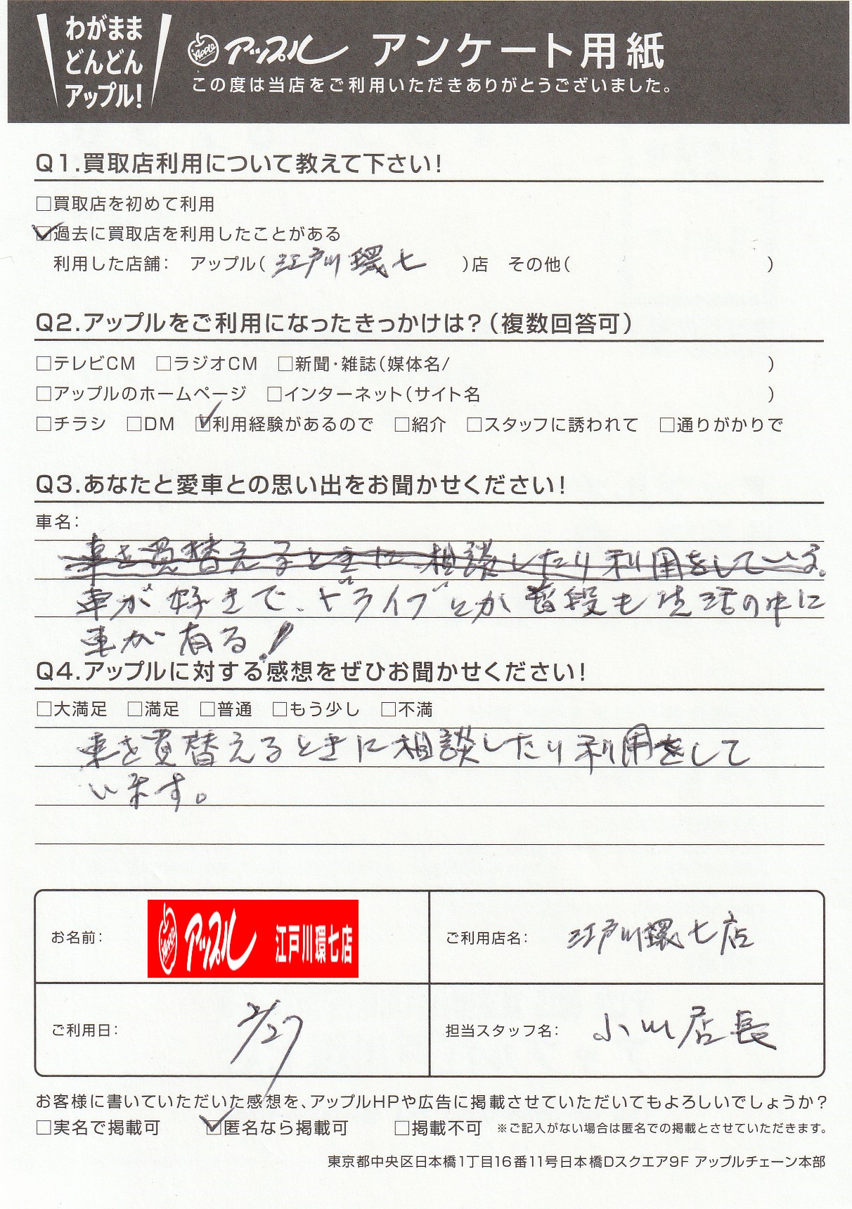 お車のご相談・ 査定だけでもOK! カンタン 入力 30秒 アップルがブランド買取始めました! お電話でも受付中! 受付時間10:00 ~ 19:00(最終査定受付時間は18:00です) 03-5658-0393 お車のご相談・ 査定だけでもOK! カンタン 入力 30秒 アップルがブランド買取始めました! お電話でも受付中! 受付時間10:00 ~ 19:00(最終査定受付時間は18:00です) 03-5658-0393 アップルがブランド買取始めました! お電話でも受付中! 受付時間10:00 ~ 19:00(最終査定受付時間は18:00です) 03-5658-0393 店舗情報 在庫車 スタッフ紹介 ブログ お客様の声 キャンペーン お得 無料査定 click お客様の声 ご記入日: -/-/- HK様 車名:トヨタ ヴェルファイア(H27年1月~のHYBRID含む) Q:あなたと愛車の思い出をお聞かせください!車が好きで、ドライブとか普段も生活の中に車が有る!Q:アップルに対する感想をぜひお聞かせください!車を買い替えるときに相談したり利用をしています。 前へ 次へ お客様の声一覧を見る