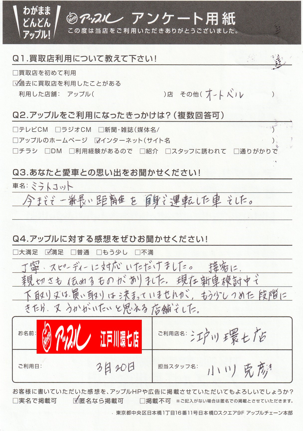 現在新車検討中で、下取り又は、買い取りは決まっていませんが、もう少しつめた段階にきたら、又うかがいたいと思える店舗でした。
