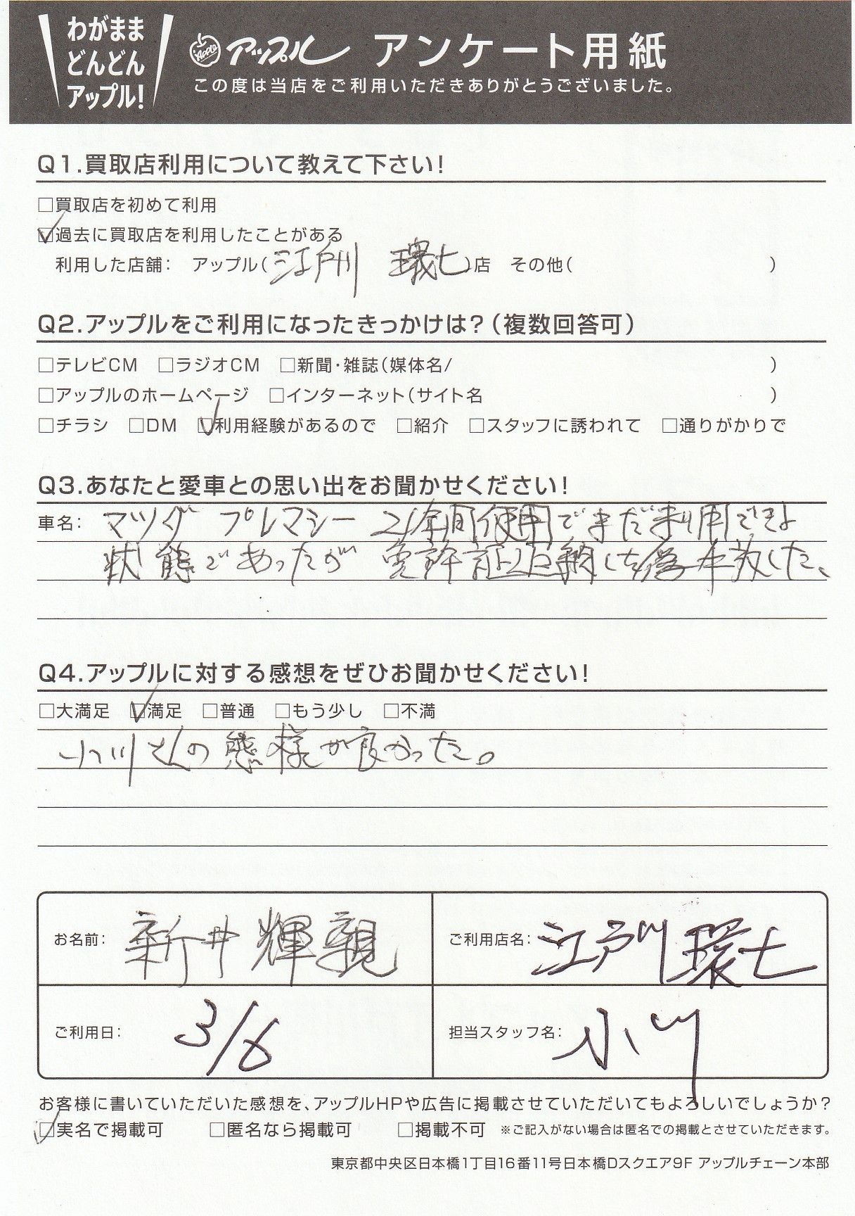 お車のご相談・ 査定だけでもOK! カンタン 入力 30秒 アップルがブランド買取始めました! お電話でも受付中! 受付時間10:00 ~ 19:00(最終査定受付時間は18:00です) 03-5658-0393 お車のご相談・ 査定だけでもOK! カンタン 入力 30秒 アップルがブランド買取始めました! お電話でも受付中! 受付時間10:00 ~ 19:00(最終査定受付時間は18:00です) 03-5658-0393 アップルがブランド買取始めました! お電話でも受付中! 受付時間10:00 ~ 19:00(最終査定受付時間は18:00です) 03-5658-0393 店舗情報 在庫車 スタッフ紹介 ブログ お客様の声 キャンペーン お得 無料査定 click お客様の声 ご記入日: -/-/- 新井輝親様 車名:マツダ プレマシー Q:あなたと愛車の思い出をお聞かせください!21年間使用でまだ利用できる状態ではあったが、免許証返納した為、手放した。Q:アップルに対する感想をぜひお聞かせください!小川さんの対応が良かった。 前へ 次へ お客様の声一覧を見る