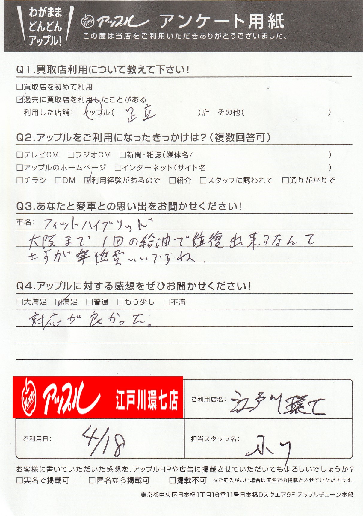 お車のご相談・ 査定だけでもOK! カンタン 入力 30秒 アップルがブランド買取始めました! お電話でも受付中! 受付時間10:00 ~ 19:00(最終査定受付時間は18:00です) 03-5658-0393 お車のご相談・ 査定だけでもOK! カンタン 入力 30秒 アップルがブランド買取始めました! お電話でも受付中! 受付時間10:00 ~ 19:00(最終査定受付時間は18:00です) 03-5658-0393 アップルがブランド買取始めました! お電話でも受付中! 受付時間10:00 ~ 19:00(最終査定受付時間は18:00です) 03-5658-0393 店舗情報 在庫車 スタッフ紹介 ブログ お客様の声 キャンペーン お得 無料査定 click お客様の声 ご記入日: 2021/04/18 O様 車名:ホンダ フィット(H25年9月以降のハイブリッド含む) Q:あなたと愛車との思い出をお聞かせください!A:大阪まで一回の給油で往復出来るなんてさすが燃費いいですね。Q:アップルに対する感想をぜひお聞かせください!A:対応が良かった。 前へ 次へ お客様の声一覧を見る