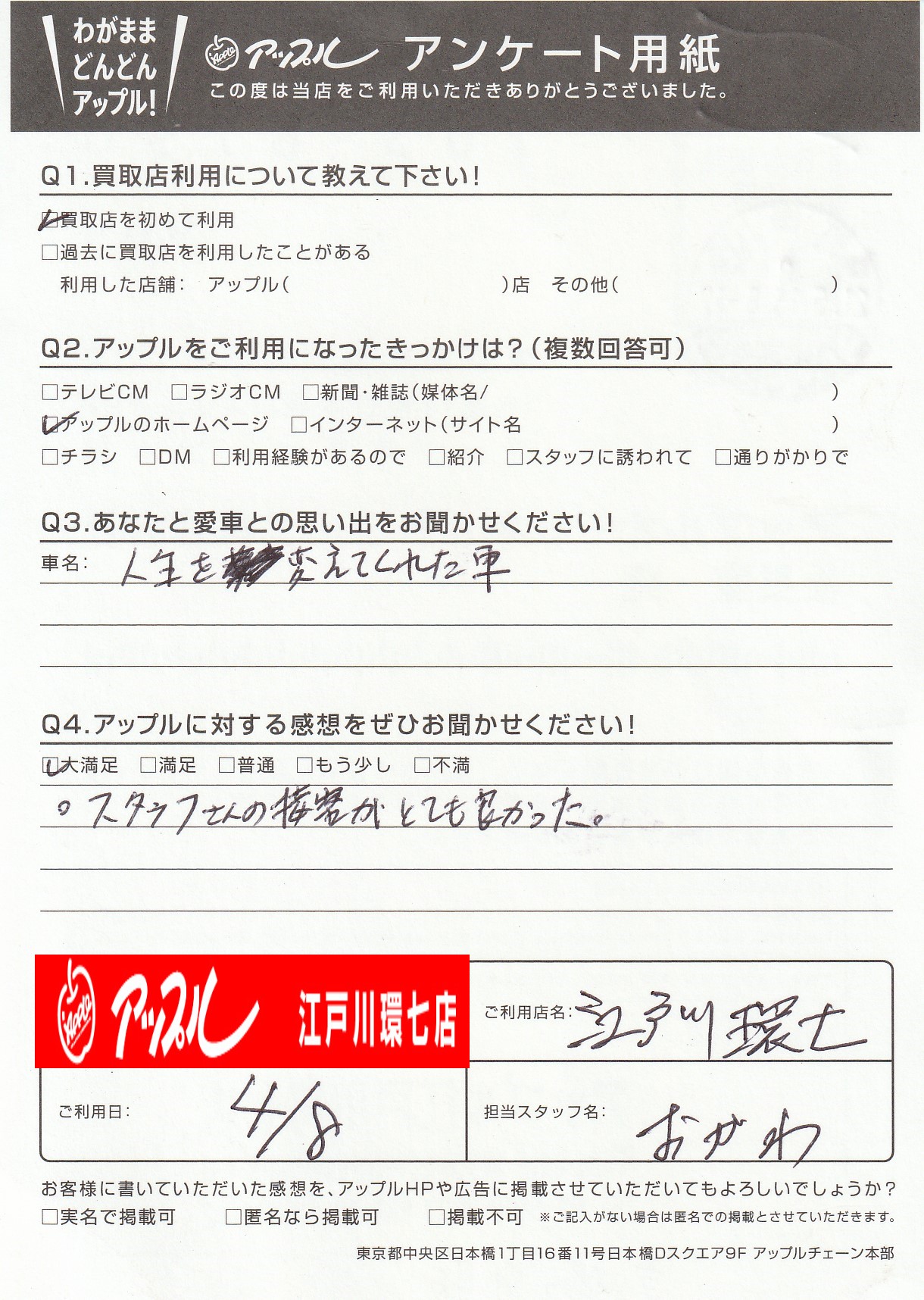 お車のご相談・ 査定だけでもOK! カンタン 入力 30秒 アップルがブランド買取始めました! お電話でも受付中! 受付時間10:00 ~ 19:00(最終査定受付時間は18:00です) 03-5658-0393 お車のご相談・ 査定だけでもOK! カンタン 入力 30秒 アップルがブランド買取始めました! お電話でも受付中! 受付時間10:00 ~ 19:00(最終査定受付時間は18:00です) 03-5658-0393 アップルがブランド買取始めました! お電話でも受付中! 受付時間10:00 ~ 19:00(最終査定受付時間は18:00です) 03-5658-0393 店舗情報 在庫車 スタッフ紹介 ブログ お客様の声 キャンペーン お得 無料査定 click お客様の声 ご記入日: 2021/04/08 S様 車名:スズキ ハスラー Q:あなたと愛車との思い出をお聞かせください!A:人生を変えてくれた車。Q:アップルに対する感想をぜひお聞かせください!A:スタッフの対応がとても良かった。 前へ 次へ お客様の声一覧を見る