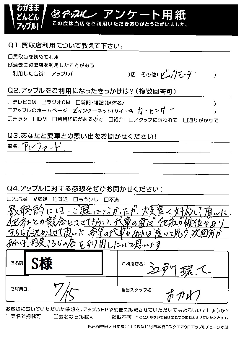 お車のご相談・ 査定だけでもOK! カンタン 入力 30秒 アップルがブランド買取始めました! お電話でも受付中! 受付時間10:00 ~ 19:00(最終査定受付時間は18:00です) 03-5658-0393 お車のご相談・ 査定だけでもOK! カンタン 入力 30秒 アップルがブランド買取始めました! お電話でも受付中! 受付時間10:00 ~ 19:00(最終査定受付時間は18:00です) 03-5658-0393 アップルがブランド買取始めました! お電話でも受付中! 受付時間10:00 ~ 19:00(最終査定受付時間は18:00です) 03-5658-0393 店舗情報 在庫車 スタッフ紹介 ブログ お客様の声 キャンペーン お得 無料査定 click お客様の声 ご記入日: 2021/07/15 S様 車名:トヨタ アルファード(H27年1月~のHYBRID含む) 前へ 次へ お客様の声一覧を見る