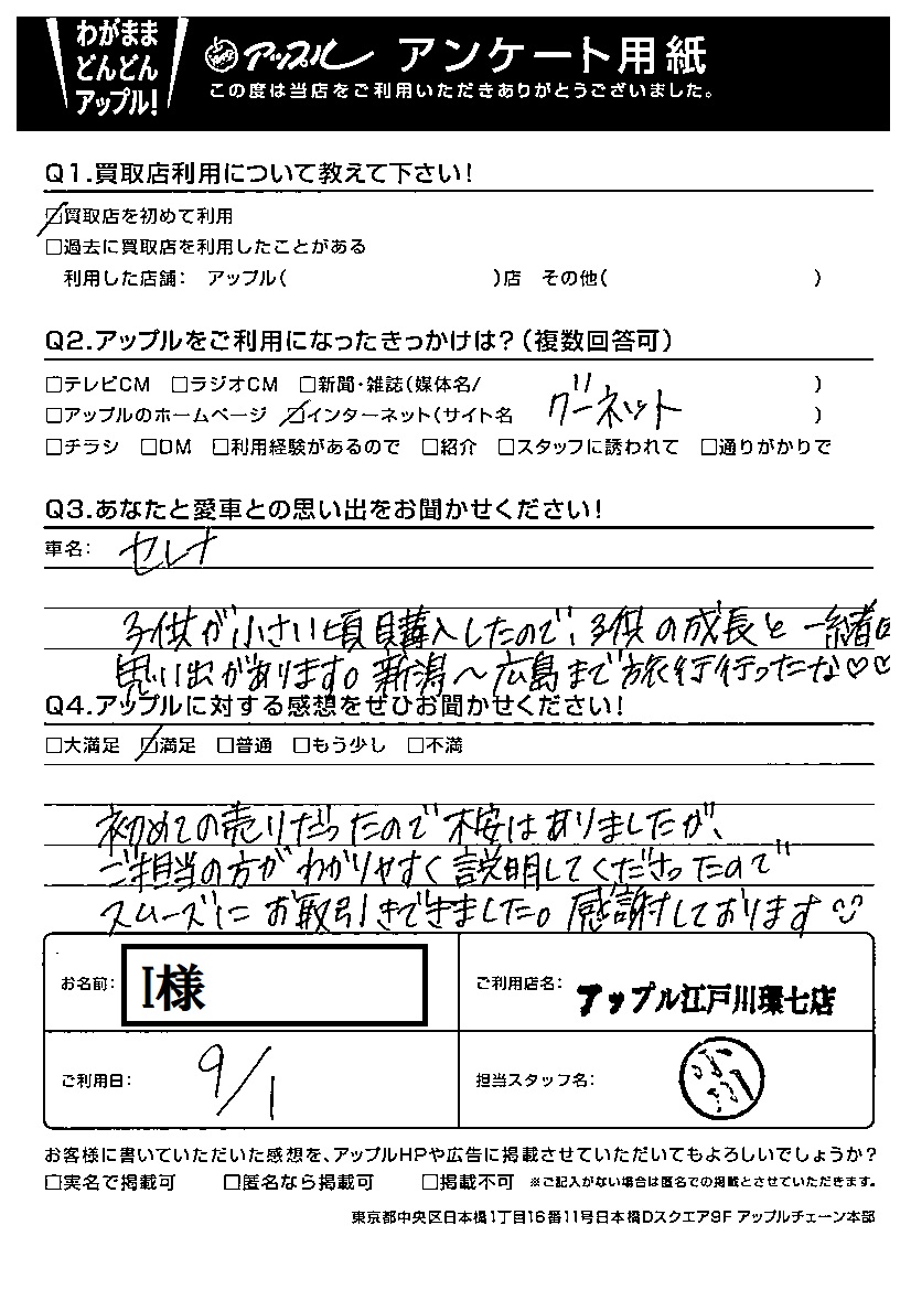 お車のご相談・ 査定だけでもOK! カンタン 入力 30秒 アップルがブランド買取始めました! お電話でも受付中! 受付時間10:00 ~ 19:00(最終査定受付時間は18:00です) 03-5658-0393 お車のご相談・ 査定だけでもOK! カンタン 入力 30秒 アップルがブランド買取始めました! お電話でも受付中! 受付時間10:00 ~ 19:00(最終査定受付時間は18:00です) 03-5658-0393 アップルがブランド買取始めました! お電話でも受付中! 受付時間10:00 ~ 19:00(最終査定受付時間は18:00です) 03-5658-0393 店舗情報 在庫車 スタッフ紹介 ブログ お客様の声 キャンペーン お得 無料査定 click お客様の声 ご記入日: 2021/09/01 I様 前へ 次へ お客様の声一覧を見る