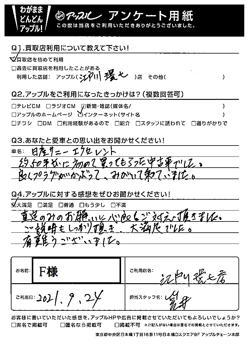 お車のご相談・ 査定だけでもOK! カンタン 入力 30秒 アップルがブランド買取始めました! お電話でも受付中! 受付時間10:00 ~ 19:00(最終査定受付時間は18:00です) 03-5658-0393 お車のご相談・ 査定だけでもOK! カンタン 入力 30秒 アップルがブランド買取始めました! お電話でも受付中! 受付時間10:00 ~ 19:00(最終査定受付時間は18:00です) 03-5658-0393 アップルがブランド買取始めました! お電話でも受付中! 受付時間10:00 ~ 19:00(最終査定受付時間は18:00です) 03-5658-0393 店舗情報 在庫車 スタッフ紹介 ブログ お客様の声 キャンペーン お得 無料査定 click お客様の声 ご記入日: 2021/09/24 F様 前へ 次へ お客様の声一覧を見る