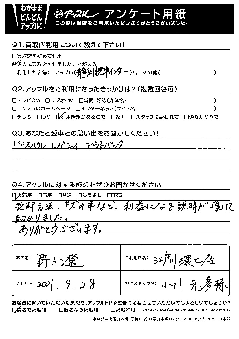 お車のご相談・ 査定だけでもOK! カンタン 入力 30秒 アップルがブランド買取始めました! お電話でも受付中! 受付時間10:00 ~ 19:00(最終査定受付時間は18:00です) 03-5658-0393 お車のご相談・ 査定だけでもOK! カンタン 入力 30秒 アップルがブランド買取始めました! お電話でも受付中! 受付時間10:00 ~ 19:00(最終査定受付時間は18:00です) 03-5658-0393 アップルがブランド買取始めました! お電話でも受付中! 受付時間10:00 ~ 19:00(最終査定受付時間は18:00です) 03-5658-0393 店舗情報 在庫車 スタッフ紹介 ブログ お客様の声 キャンペーン お得 無料査定 click お客様の声 ご記入日: 2021/09/28 野上様 車名:スバル レガシィアウトバック(H15年10月~) アウトバック(H15年10月~) 前へ 次へ お客様の声一覧を見る