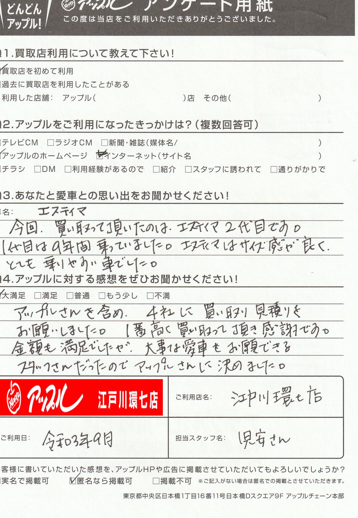 お車のご相談・ 査定だけでもOK! カンタン 入力 30秒 アップルがブランド買取始めました! お電話でも受付中! 受付時間10:00 ~ 19:00(最終査定受付時間は18:00です) 03-5658-0393 お車のご相談・ 査定だけでもOK! カンタン 入力 30秒 アップルがブランド買取始めました! お電話でも受付中! 受付時間10:00 ~ 19:00(最終査定受付時間は18:00です) 03-5658-0393 アップルがブランド買取始めました! お電話でも受付中! 受付時間10:00 ~ 19:00(最終査定受付時間は18:00です) 03-5658-0393 店舗情報 在庫車 スタッフ紹介 ブログ お客様の声 キャンペーン お得 無料査定 click お客様の声 ご記入日: -/-/- A様 前へ 次へ お客様の声一覧を見る