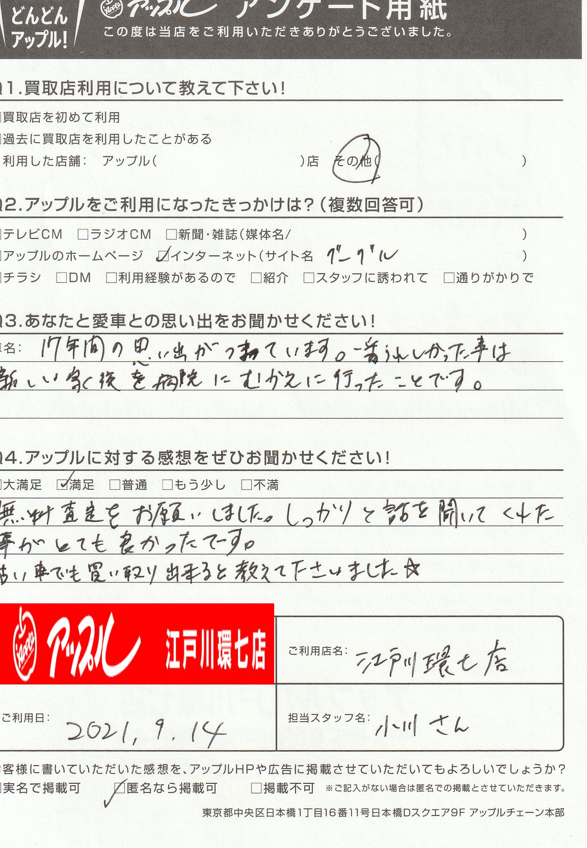 お車のご相談・ 査定だけでもOK! カンタン 入力 30秒 アップルがブランド買取始めました! お電話でも受付中! 受付時間10:00 ~ 19:00(最終査定受付時間は18:00です) 03-5658-0393 お車のご相談・ 査定だけでもOK! カンタン 入力 30秒 アップルがブランド買取始めました! お電話でも受付中! 受付時間10:00 ~ 19:00(最終査定受付時間は18:00です) 03-5658-0393 アップルがブランド買取始めました! お電話でも受付中! 受付時間10:00 ~ 19:00(最終査定受付時間は18:00です) 03-5658-0393 店舗情報 在庫車 スタッフ紹介 ブログ お客様の声 キャンペーン お得 無料査定 click お客様の声 ご記入日: -/-/- Y様 前へ 次へ お客様の声一覧を見る