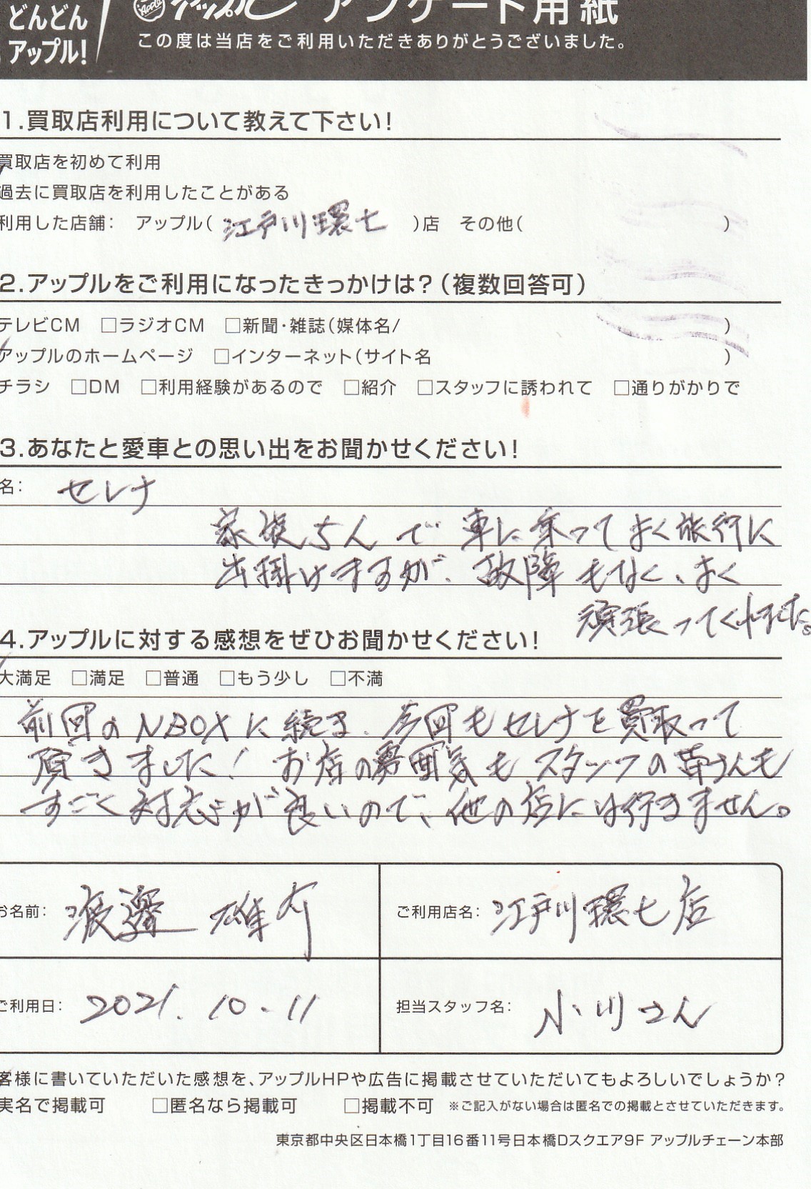 お車のご相談・ 査定だけでもOK! カンタン 入力 30秒 アップルがブランド買取始めました! お電話でも受付中! 受付時間10:00 ~ 19:00(最終査定受付時間は18:00です) 03-5658-0393 お車のご相談・ 査定だけでもOK! カンタン 入力 30秒 アップルがブランド買取始めました! お電話でも受付中! 受付時間10:00 ~ 19:00(最終査定受付時間は18:00です) 03-5658-0393 アップルがブランド買取始めました! お電話でも受付中! 受付時間10:00 ~ 19:00(最終査定受付時間は18:00です) 03-5658-0393 店舗情報 在庫車 スタッフ紹介 ブログ お客様の声 キャンペーン お得 無料査定 click お客様の声 ご記入日: 2021/10/11 渡邊様 車名:日産 セレナ 前へ 次へ お客様の声一覧を見る