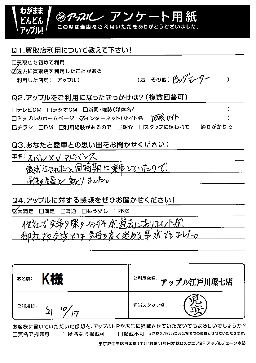 お車のご相談・ 査定だけでもOK! カンタン 入力 30秒 アップルがブランド買取始めました! お電話でも受付中! 受付時間10:00 ~ 19:00(最終査定受付時間は18:00です) 03-5658-0393 お車のご相談・ 査定だけでもOK! カンタン 入力 30秒 アップルがブランド買取始めました! お電話でも受付中! 受付時間10:00 ~ 19:00(最終査定受付時間は18:00です) 03-5658-0393 アップルがブランド買取始めました! お電話でも受付中! 受付時間10:00 ~ 19:00(最終査定受付時間は18:00です) 03-5658-0393 店舗情報 在庫車 スタッフ紹介 ブログ お客様の声 キャンペーン お得 無料査定 click お客様の声 ご記入日: 2021/10/27 K様 車名:スバル XV (2017年5月~) 前へ 次へ お客様の声一覧を見る
