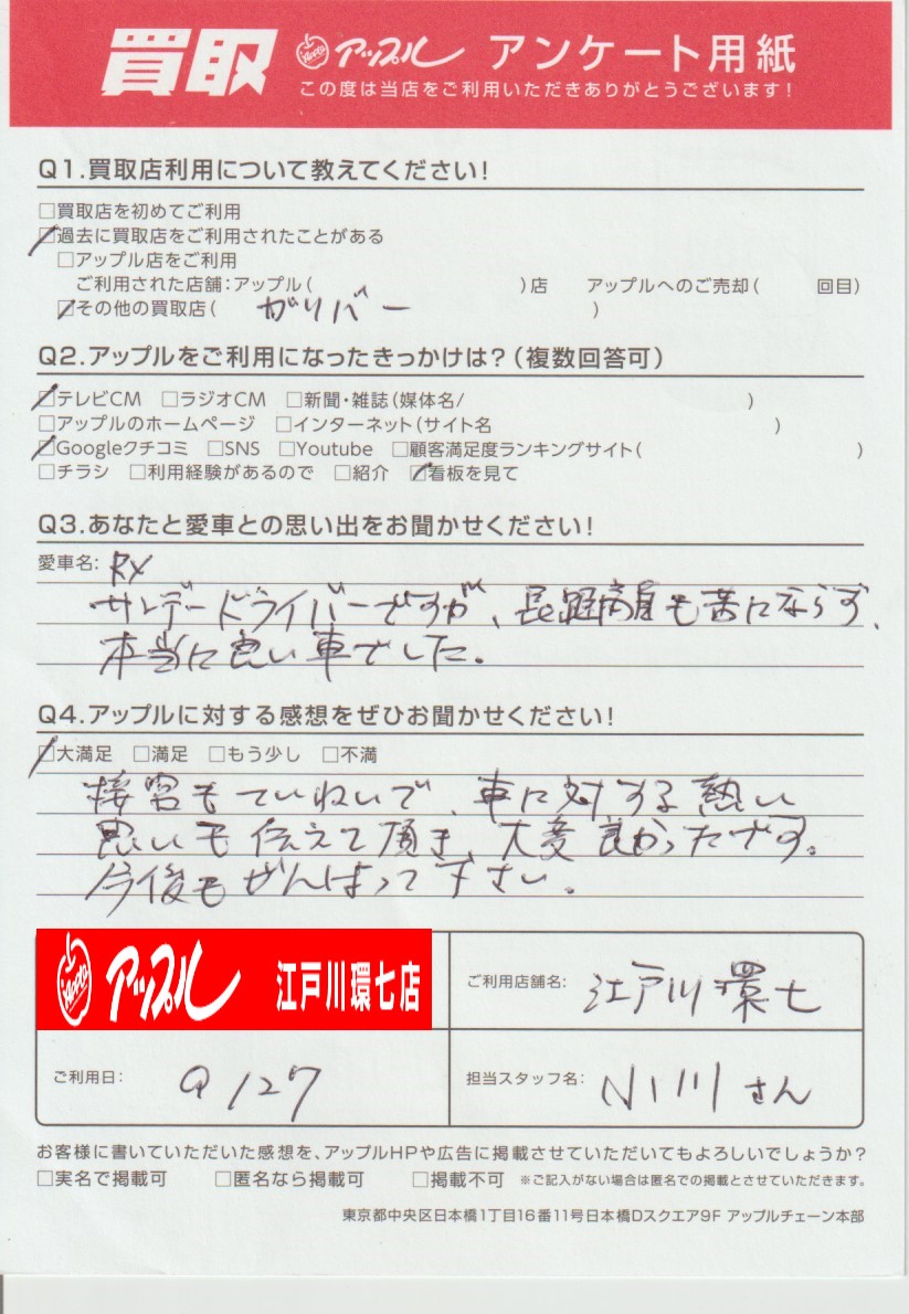 A:接客もていねいで、車に対する熱い思いも伝えて頂き、大変良かったです。今後もがんばってください